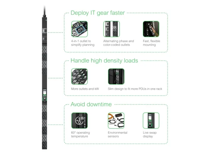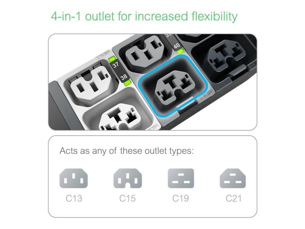 Best in class intelligent rack power distribution (PDU) with up to 50% more power, twice as many outlets, and a 4-in-1 combination outlet design for fast, flexible deployment in modern data centers.