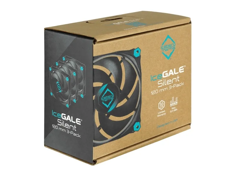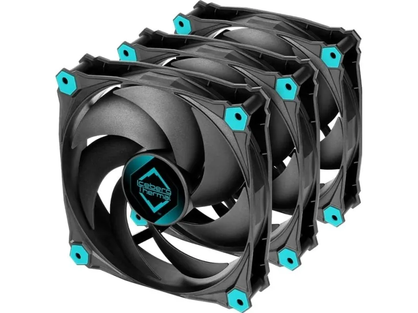Iceberg Thermal IceGale Silent computerkabinet ventilator 12 cm sort 3 stk.(e) Type: Ventilator Blæserdiameter 12 cm Rotationshastighed (maks.) 1100 RPM Støjniveau (høj hastighed) 12,3 dB Maksimal luftstrøm 30 cfm Maksimum Maximum lufttryk 0,6 mmH2O Lejetype: Glideleje. Spænding 12 V. produktfarve: Sort