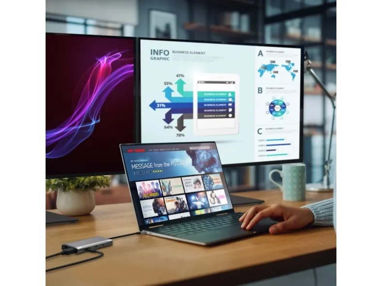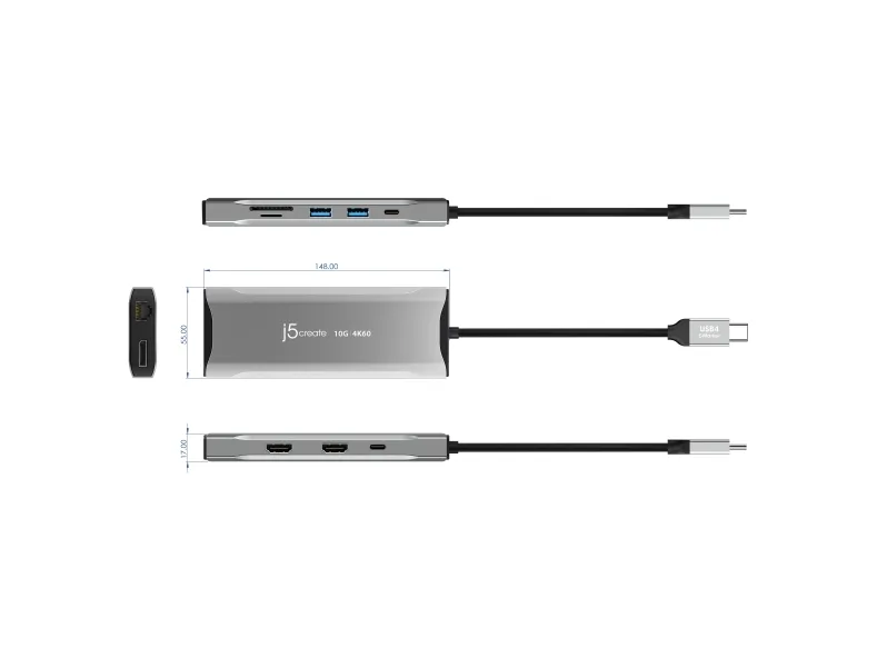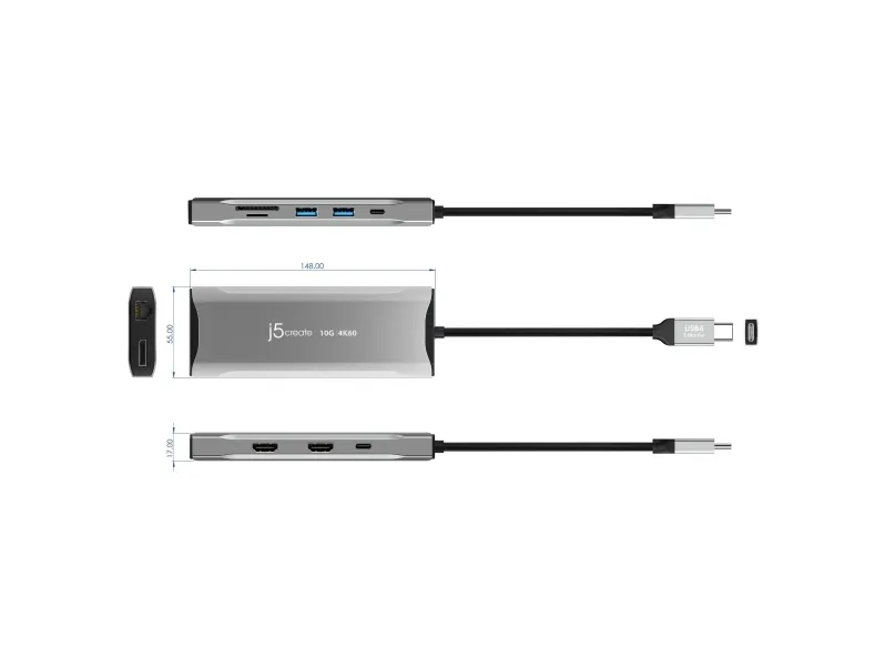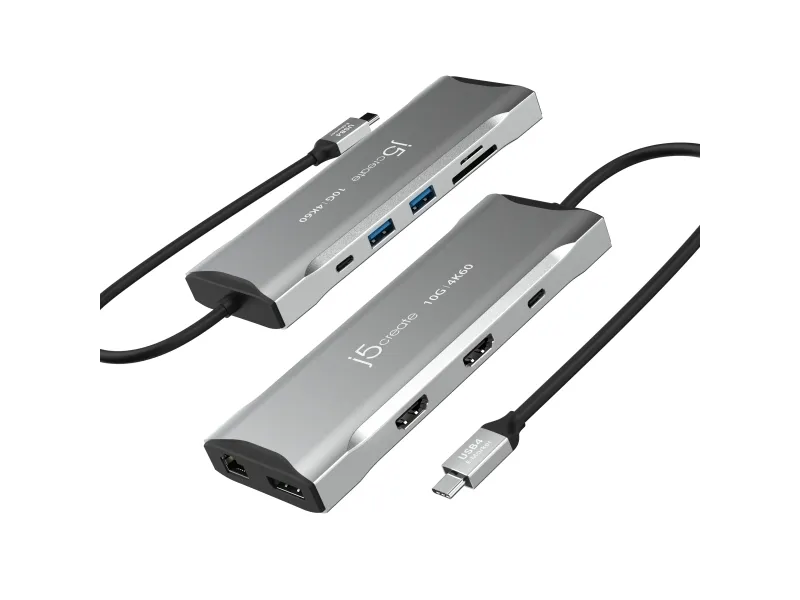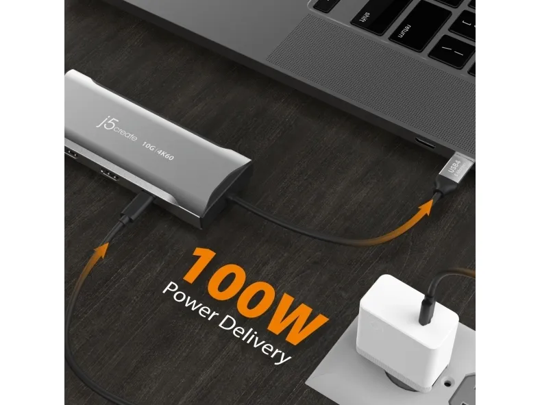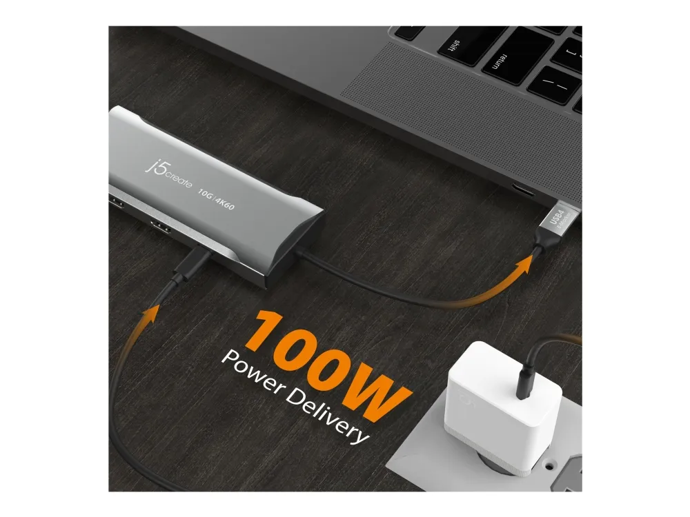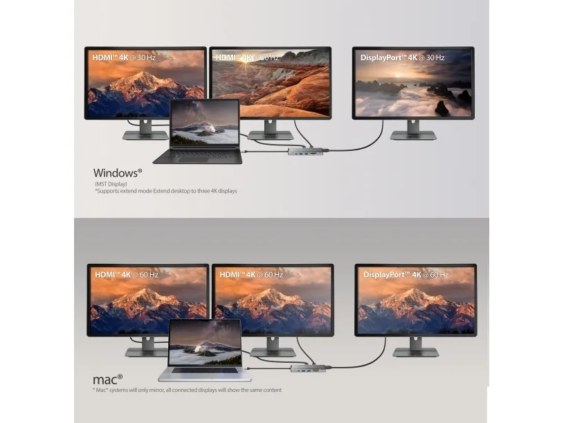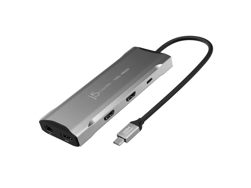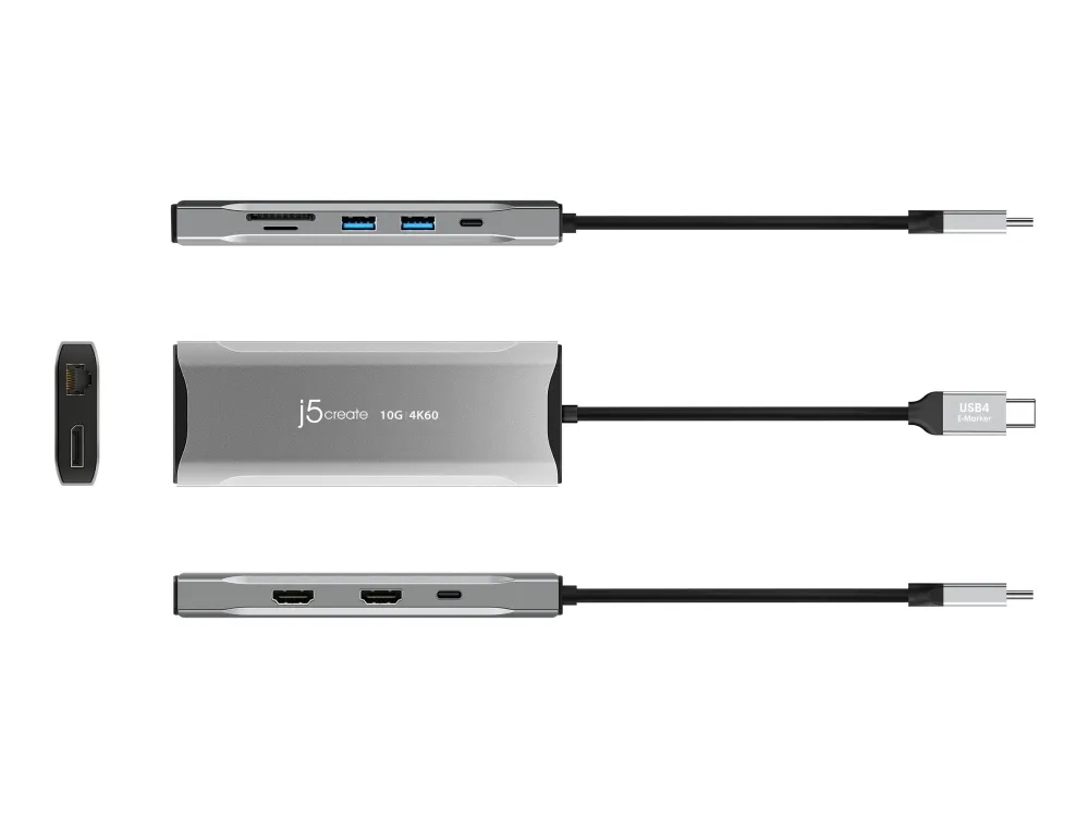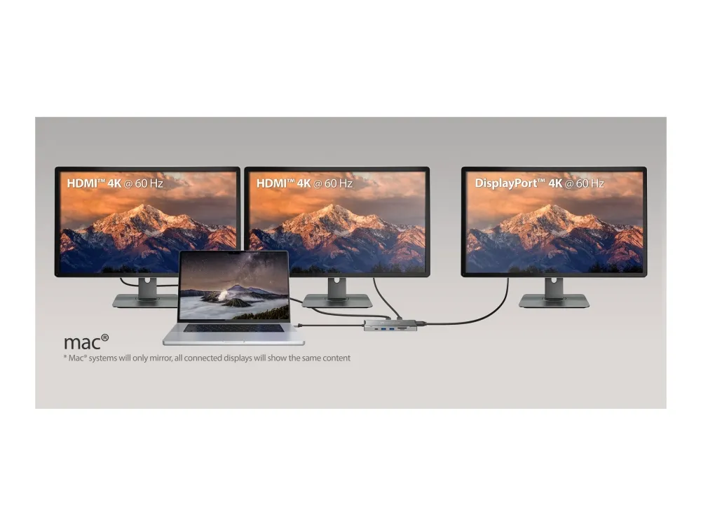 Denne mini-dokkingstasjonen for flere skjermer er utstyrt med en avansert USB-C E-Mark-brikke og er kompatibel med verter og enheter som har USB4. Den har alt du trenger, fra tre videoutganger til 10 Gbps USB-porter, samt gjennomgangslading med 100 W Power Delivery.
