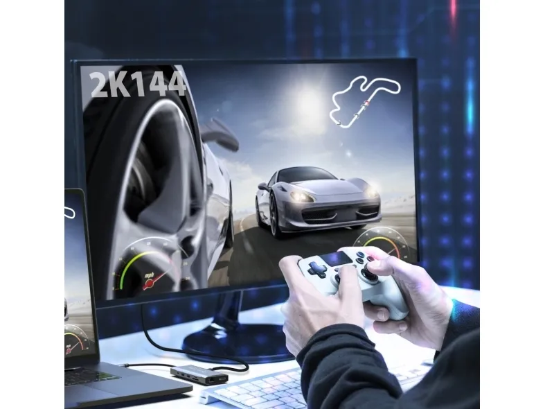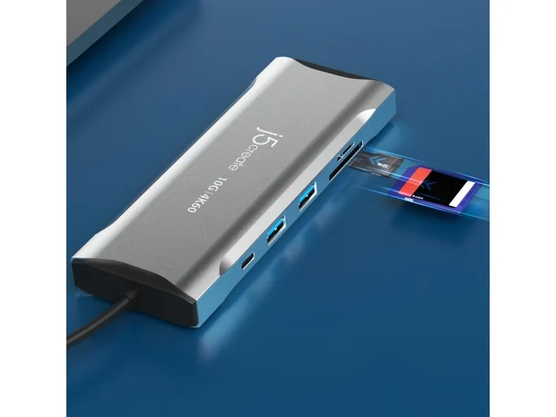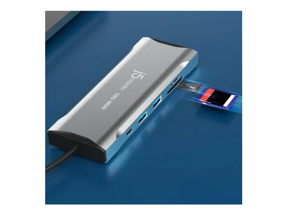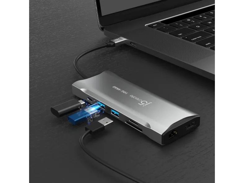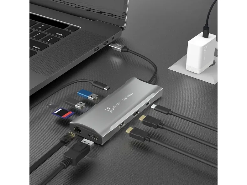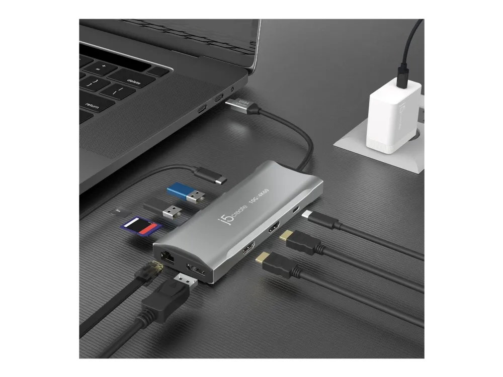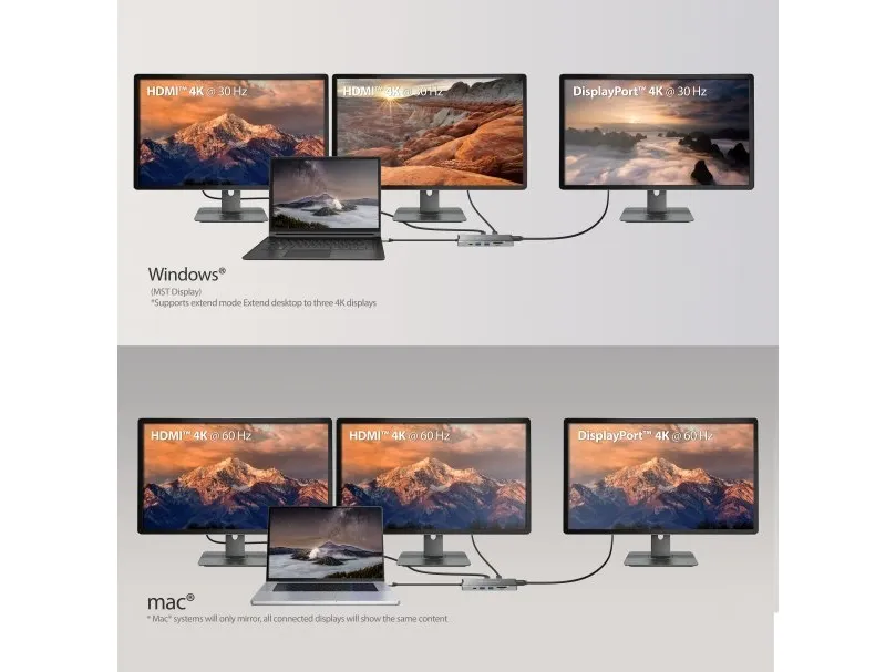 Denne USB-C mini-dokkingstasjonen støtter DisplayPort 1.4 og Multi-Stream Transport (MST), og gir deg muligheten til å lage en dobbel eller trippel 4K-arbeidsstasjon med to HDMI-utganger og én DisplayPort-utgang. Den gir tre USB SuperSpeed 10 Gbps-porter (2 USB-C og 1 USB Type-A) for tilkobling av ekstrautstyr eller nedstrømslading, en SD- og microSD 4.0-minnekortleser/skriver for å administrere mediefilene dine og en Gigabit Ethernet-port for å få tilgang til et kablet nettverk. Den støtter også Power Delivery 3.0, som gir opptil 100 W gjennomgangslading for å drive tilkoblet ekstrautstyr og lade den bærbare vertsmaskinen med en USB-C-strømadapter.