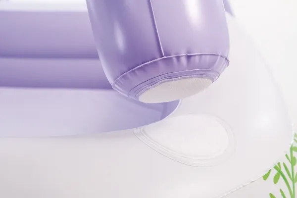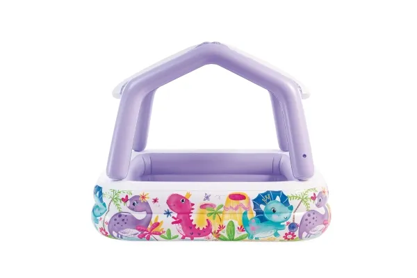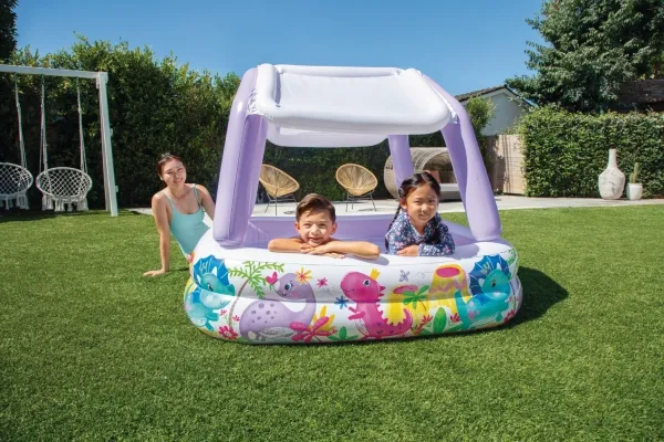 Minibasseng med avtagbar solskjerm. På de spesielt solrike dagene er det lurt å holde seg i skyggen under de varmeste timene. Hvorfor ikke gjøre det med dette oppblåsbare 295 liters bassenget med avtagbar tag? Måler 157x157x122 cm og rommer 295 L. Inkl. reparasjonslapp, avtagbart tak og innbygget avløp. Fra 2 år – men under oppsyn av en voksen.