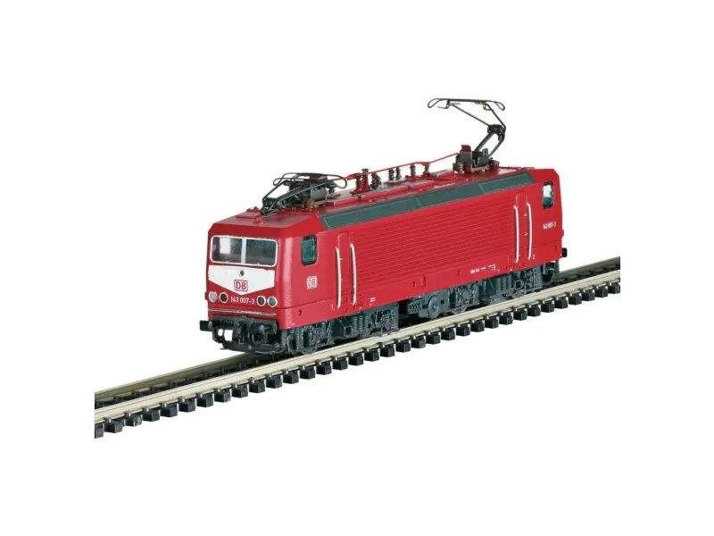 N E-LOKOMOTIV BR 143 FRA DB AG, MHI Forbillede: El-lokomotiv 143 007-3 fra Deutsche Bahn AG (DB AG). Akselfølge Bo'Bo', Byggeår fra 1984. Driftstilstand fra 1994.anvendelse: Gods- og passagertog.Model: Hus og holder i trykstøbt zink. Indbygget digital-dekoder og lydgenerator til drift med MFX og DCC. Motor med svinghjul, 4 aksels drevet, friktionsdæk. Forlygter og baglygter skifter med kørselsretningen, varmhvide lysdioder, førerhus belysning, kan kobles digitalt. Kortkoblingskinematik Køreretningsafhængigt skiftende spidssignal i drift analogt. Påsatte gelændergreb. Længde over buffer 104 mm. Enestående serie. Passer til dette lokomotiv og personvogne fås under varenumre 18263 og 18449.