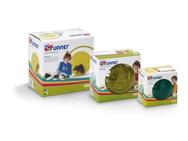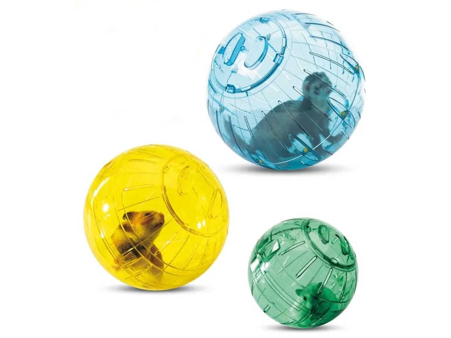 Springboll för stora guldhamstrar eller degu. För att ge god sysselsättning så de kan röra sig över stora områden i hemmet utan rymningsrisk. Var noggrann så de inte kan komma nerför trappor eller liknande. Levereras i någon av färgerna på bild.