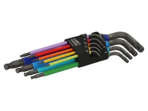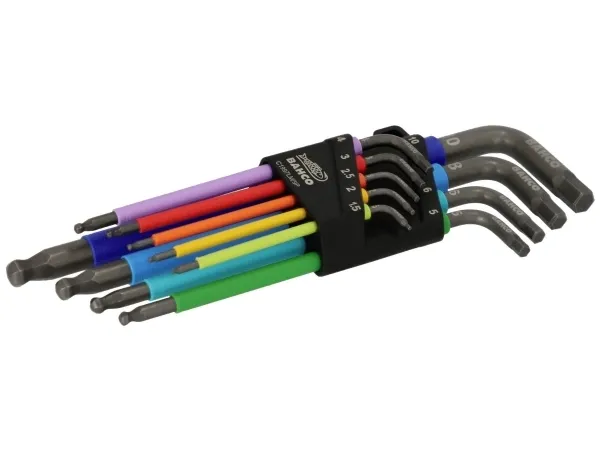 Multicolour vinkelskruetrækker-sæt til skruer med indvendig sekskant, 1.5 - 10 mm, 9-dele Farvet stiftnøglesæt med sekskantspids og kuglehoved, 9 dele, lang, metrisk Easy fit-funktion: Sikker fastholdelse og enkel udtagning og isætning af stiftnøgler takket være et eksklusivt monteringssystem Simpel identificering af farver afhængigt af farvespekredsen efter størrelse Edge Plus: Skråtandet kantdesign for bedre overfladekontakt Robust holder med soft-touch for at sikre, at alle stiftnøgler opbevares sikkert og velorganiseret Sprøjtestøbt greb med soft-touch-feeling: Behagelig, skridsikkert greb og oliebestandig Phosphaering: Korrosionsbeskyttelse for en lang levetid Kuglehoved: ideal til arbejde i trange og svært tilgængelige rum Den lange arm sørger for en højere overførsel af drejningsmomentet og bedre tilgængelighed Fuldt hærdet stål af høj kvalitet Lasermærket og dermed slidstærk størrelsesmarkering til hurtig adgang til alle størrelser