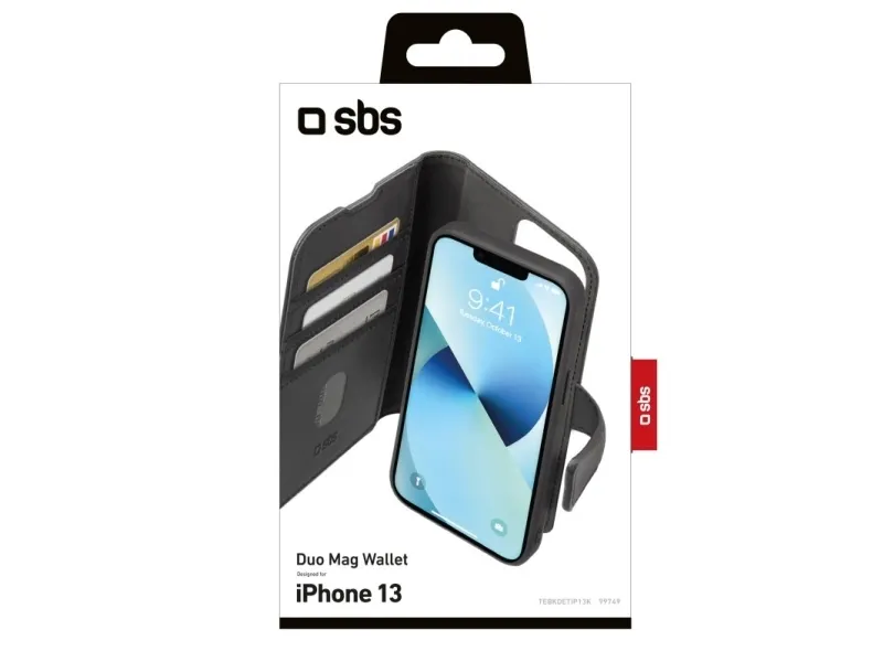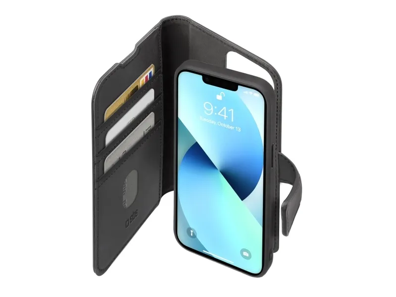 SBS book cover med aftageligt cover til iPhone 13®. Sort. Magnetisk lukning Hårdt book cover Aftageligt PC+TPU cover Magnetisk lukning 3 lommer til kreditkort Dette SBS book cover med aftageligt cover er designet til at beskytte din mobil mod stød og skrammer. Du kan bruge coveret på to måder; som et book cover med tre kreditkort-lommer og magnetisk lukning. Eller som et almindeligt, slankt cover.