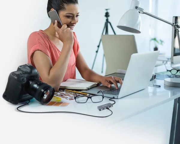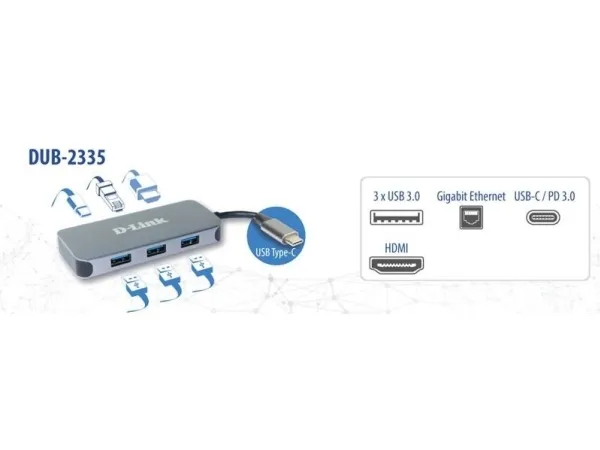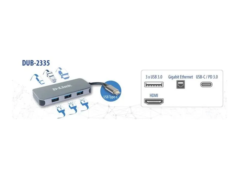 D-Link DUB-2335 dokkingstasjon utvider enhetens tilkoblingsmuligheter. Dette portutvidelsesverktøyet er designet for profesjonelle og teknologientusiaster, og integrerer en rekke porter, inkludert HDMI, USB-C / Thunderbolt 3 med Power Delivery og SuperSpeed USB 3.0, noe som gjør den allsidig for tilkobling av flere enheter. Med den integrerte 11,5 cm lange USB-C-kabelen sørger DUB-2335 for et ryddig oppsett, noe som forbedrer effektiviteten og estetikken på arbeidsplassen din.