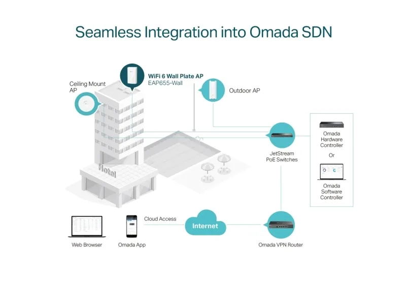 Seamless Integration into Omada SDN The Omada Software Defined Networking (SDN) platform integrates network devices including access points, switches, and routers to provide 100% centralized cloud management and create a highly scalable network—all controlled from a single interface