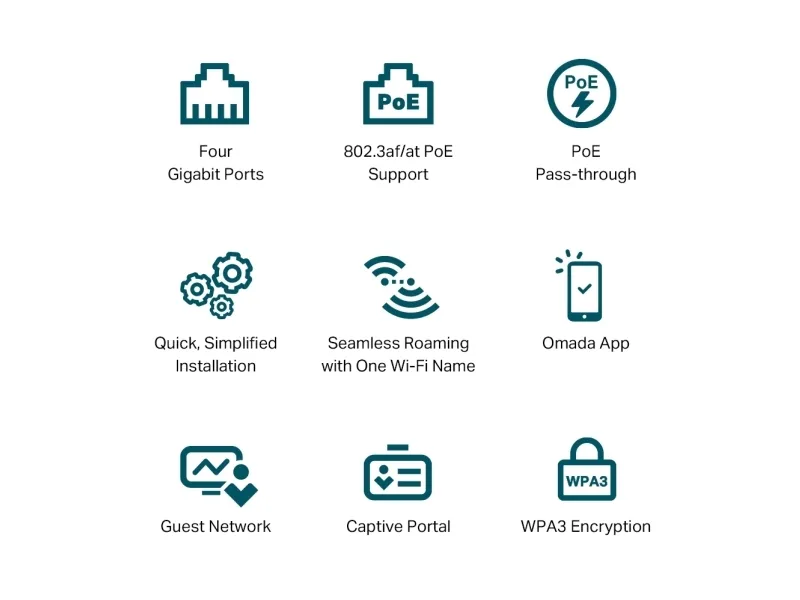 Easy Management with the Omada App Follow configuration instructions on the Omada app to get set up in minutes. Omada lets you configure settings, monitor the network status, and manage clients, all from the convenience of your mobile device.TP-Link Omada AX3000 Wall Plate WiFi 6 Access Point. 2.4 GHz, 5 GHz, Maximum data transfer rate: 2402 Mbit/s. Security algorithms: HTTPS, SNMP, SNMPv2, SNMPv3, SSH, WPA-Enterprise, WPA2-Enterprise, WPA3-Enterprise. Ethernet LAN data rates: 10,100,1000 Mbit/s. Power over Ethernet (PoE). Product colour: White