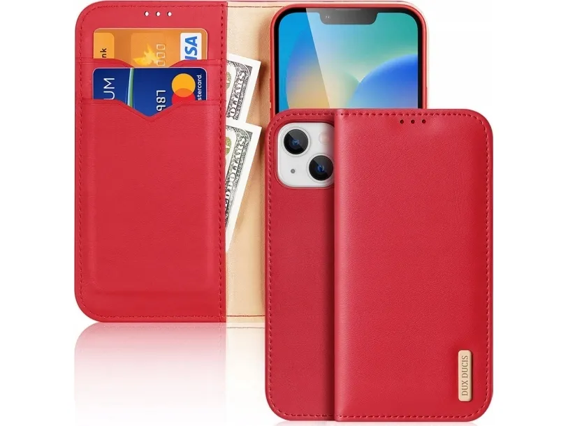 Dux Ducis Hivo Leather Flip Case Ekte lærveske Lommebok for kort og IDer iPhone 14 Plus Red
