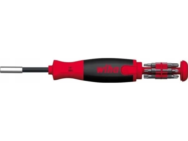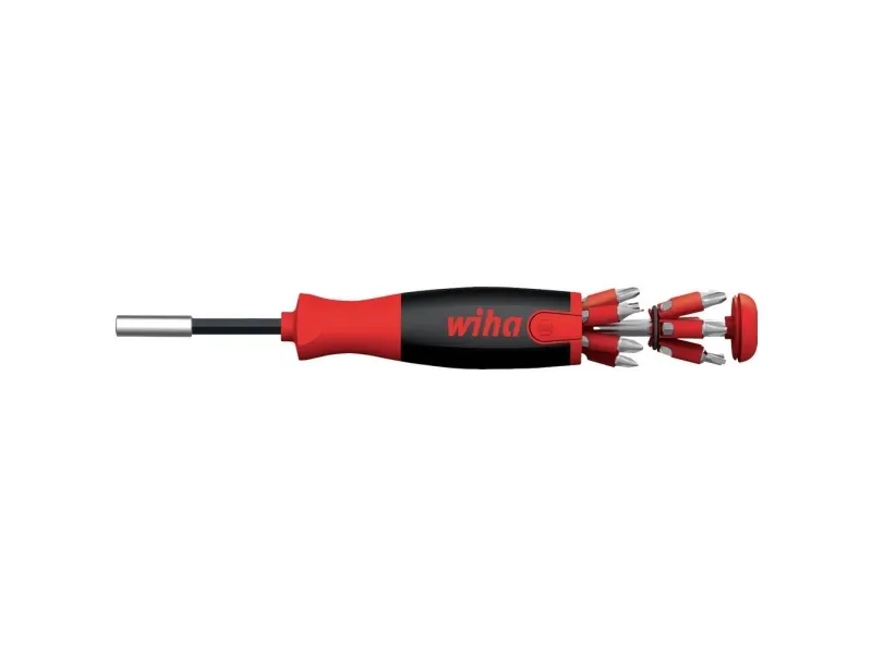 Skruetrækker med bit magasin LiftUp 25 magnetisk blandet med 12 bits, 1/4 (38605) Ikke sjældent sker det, at der i mobilt brug er brug for en skruetrækker med en bestemt profil, som håndværkeren ikke lige har ved hånden. Wiha-skruetrækkeren med bit-magasin LiftUp 25 sætter en stopper for dette, da man med kun ét værktøj har 12 forskellige kraftudtag, når som helst og hvor som helst. På den måde erstatter LiftUp et helt skruetrækker-sæt. Med et tryk på en knap kører bit-magasinet ud ved enden af grebet og frigiver 25 mm bits med 1/4 drev til udtagning. De medfølgende standardbits kan anvendes både til hånd- og maskindrift. Det ergonomisk formede tokomponenthåndtag sørger takket være den store volumen for optimal kraftoverførsel og højeste drejemomentværdier. Kraftig isætning eller udtagning af skruer bliver dermed særligt let i hånden.