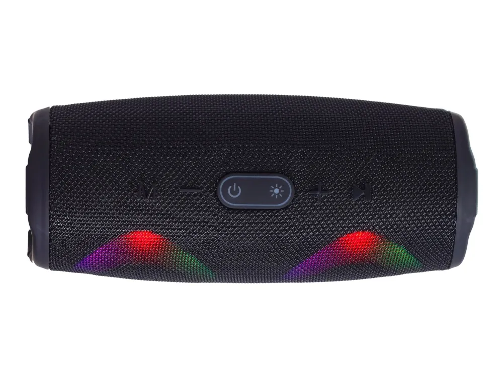 Kenmerken: Portable BT party speaker LED light effect Stream your music wirelessly, signal reach up to 10 m Multi-color LED light effect flashes and changes color Also plays music directly from micro SD card, USB stick (max 32GB), or via AUX-input Long battery life - up to 4 hours of music streaming on a single charge Specificaties: Interface: BT v.5 BT frequency range: 2.402 GHz – 2.480 GHz RF transmit power: < 9 dBm Speakers: 4 Ohm, 75 mm diameter RMS power output: 2 x 5 W Frequency response: 150Hz - 18KHz S/N ratio: > 90 db, TDH+N<10% MicroSD card support: up to 32 GB USB-AF port: flash drive support up to 32 GB AUX: 3.5 mm DC input: Micro-USB 5 VDC up to 1 A Battery: rechargeable 1200 mAh Li battery Charging time: 3 hrs Dimensions: 95 x 105 x 225 mm (LxDxH) Net weight: 0.63 kg Systemeisen: BT enabled audio source (Computer, smartphone, tablet) Inhoud: BT speaker Micro-USB charging/AUX cable User manual