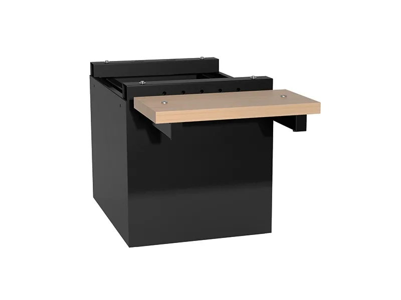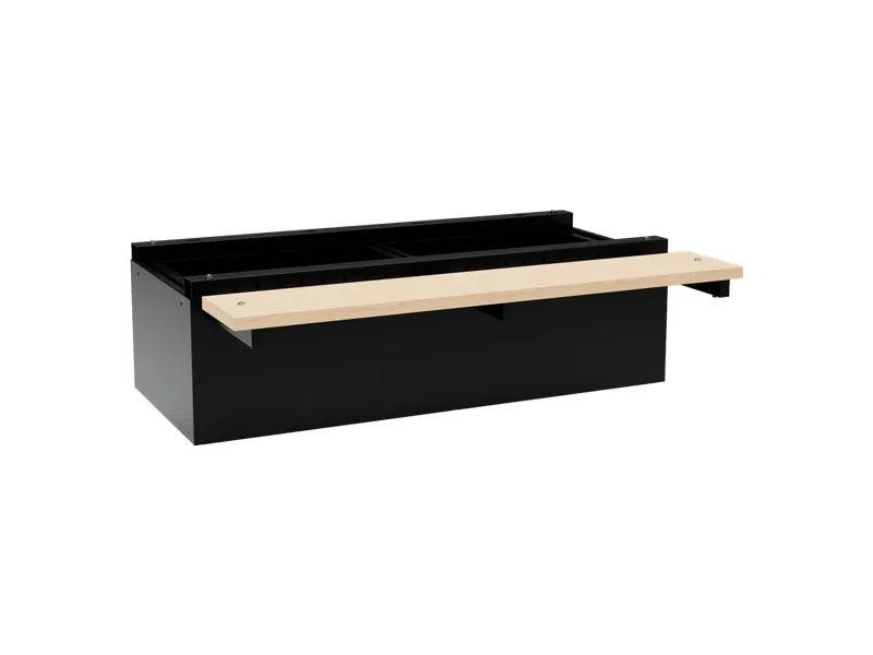 Høj sokkel med bænkkonsol til garderobeskabe med bredde 1200 mm og dybde 550 mm. Sokkelhøjde er 320 mm, som lægges til skabets højde for at få en totalhøjde. Produceret af pulverlakeret metal. Farve sort RAL 9005. Siddebænk i birk højtrykslaminat. Total dybde er 865 mm.