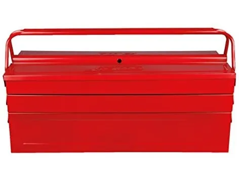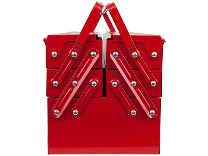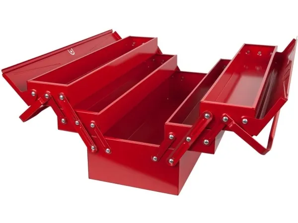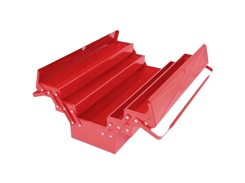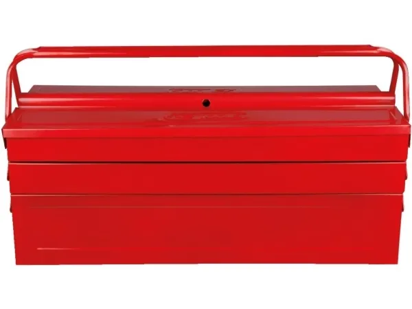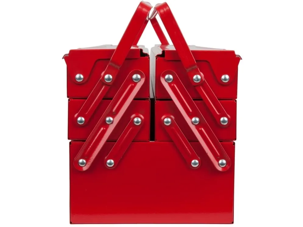 Værktøjskasse metal, 5 rum, 550mm Med nittede ledRum kan trækkes meget ud.God stabilitetKanter dobbelt falsetKan låses med en hængelåsrød pulverlakeringFremstillet af elektrolytisk forzinket stålplade