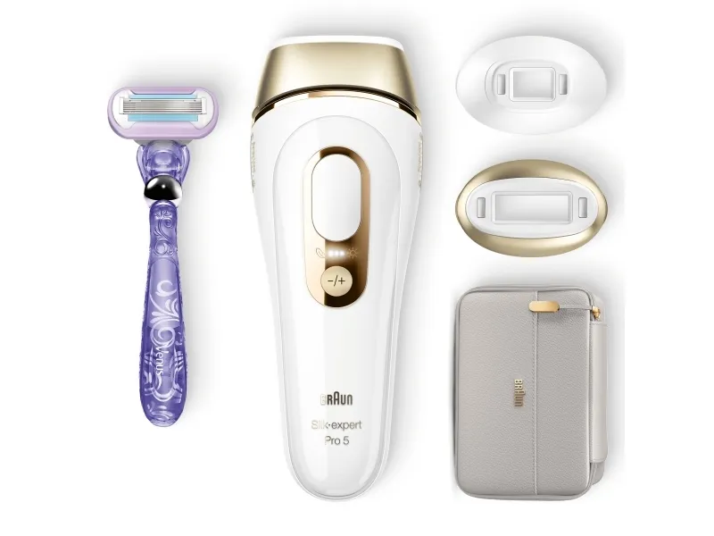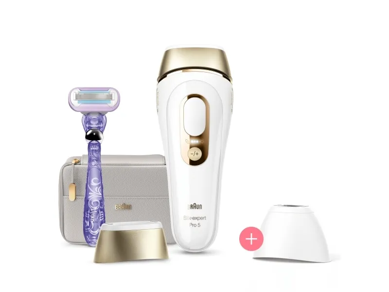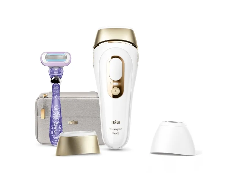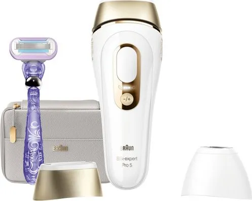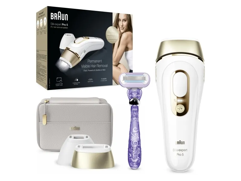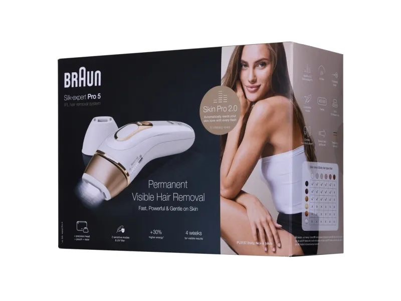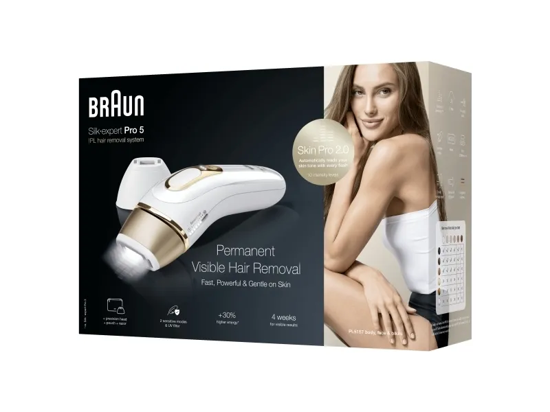 Braun Silk-expert Pro Silk·expert Pro 5 PL5157. Product colour: Gold, White, Hair removal technology: Intense pulsed light (IPL), Country of origin: United Kingdom. Power source: AC, AC input voltage: 100 - 240 V. Weight: 1.28 kg. Package type: Box, Package width: 97.5 mm, Package depth: 276 mm. Quantity per pack: 1 pc(s), Master (outer) case width: 211 mm, Master (outer) case length: 296 mm
