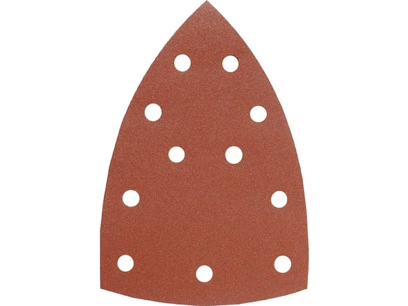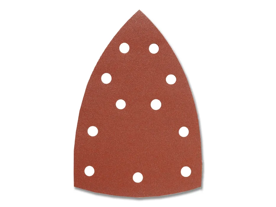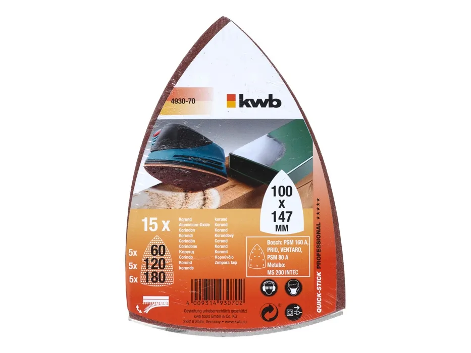 QUICK-STIK slibekrehjørne, TRÆ og METAL, 100 x 147 mm Slibeskind, TRÆ & METAL, selvhæftende, ædelkorund, 100 x 147 mm, aluminiumoxid-oxid bestrøet, fuldt harpiksbundet, forstærket bæremateriale, med velour-bagside, Perforeret, til delta- /trekantssliber, til slibning af metal og træ, farve, lak, spartel, sten og plast.
