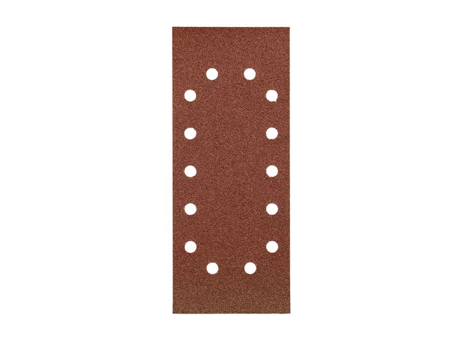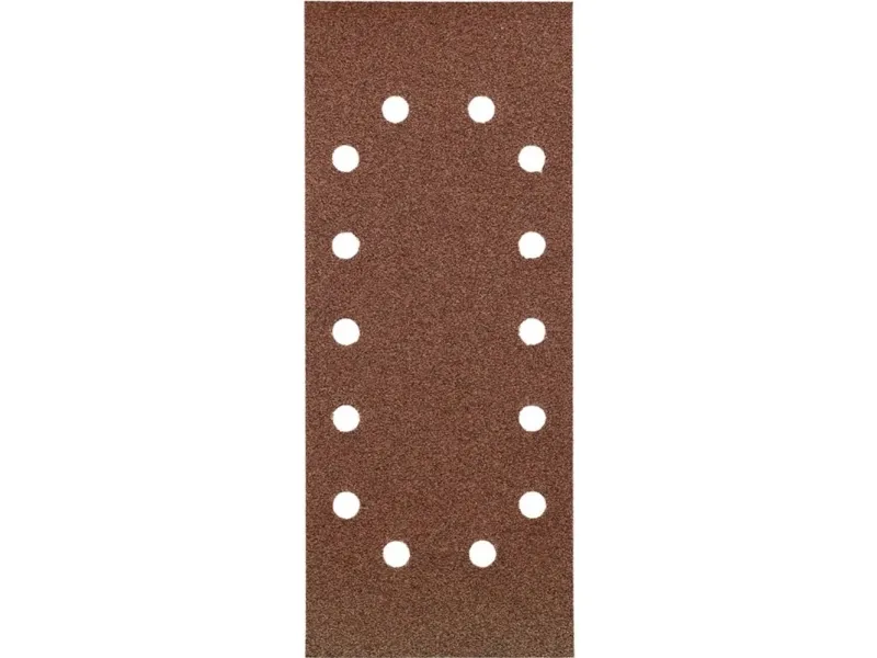 Slibestrimler, TRÆ og METAL, korund, 115 x 280 mm, hullet, K 80 Slibestriber TRÆ og METAL, 115 x 280 mm, korund, universelt perforeret, aluminiumoxid, stress, til træ og metal, til fjernelse af rust, maling, lak og spartel. Til rystepudsere med udsugningssystem.