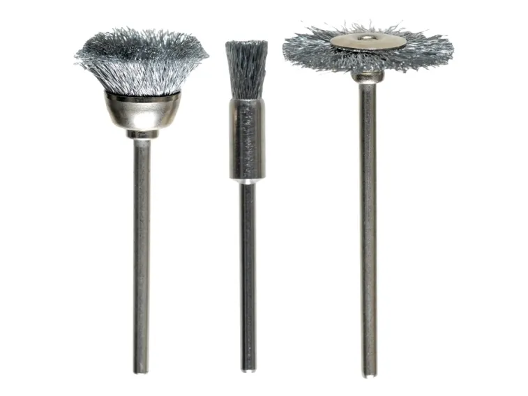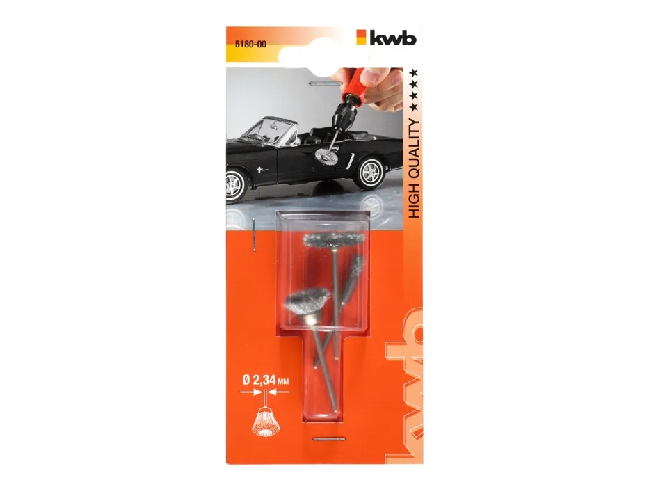 Trådsbørstesæt, 3-dele, HSS ståltråd, bølget Trådsbørstesæt, 3-dele., HSS ståltråd, bølget, til finbearbejdning, Til fjernelse af rust, fjernelse af farve, rengøring og mattering, til anvendelse i mini-boremaskinesystemer og bøjelige aksler, ideal til modelbyggeri.