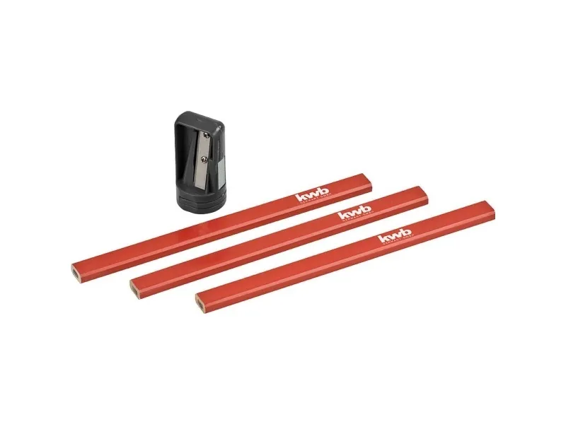 Tømrerblyanter med spidser, 4-dele. Uspændt, kantet, rød, 180 mm lang, HB-patron, Med spidser til firkantede og ovale værelsesmannblyanter, med integreret slibesten til finslibning, ideal for håndværk, byggeplads, husholdning og hobby, skriver på mange underlag som træ, beton, mursten, sten, gipskarton.
