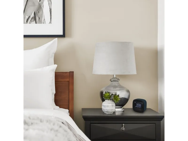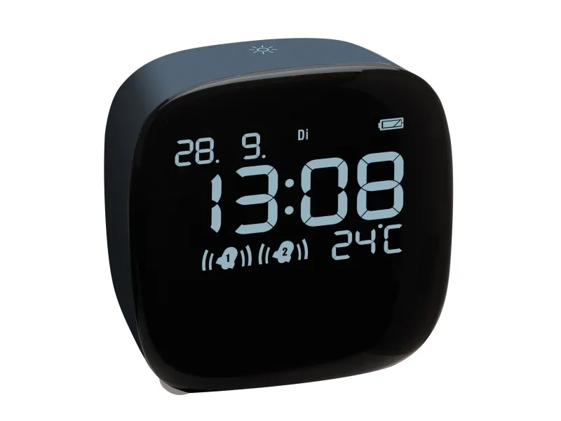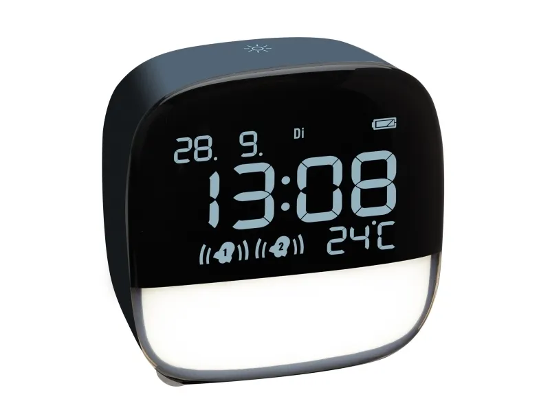 Digitalt vækkeur og LED-natlys 60.2034.06 Vækkeur med integreret natlys2 vækketidspunkter, 3 lydstyrketrin, snooze-funktionIndendørstemperaturDato med ugedag (på tysk)Natlys med automatisk tænd- /slukfunktion, indstillelig varighed (5 til 60 minutter), kan dæmpes trinløst (10-100%)Integreret batteri til opladning via mikro-USB-kabel og strømforsyning (medfølger)I batteridrift: Displaybelysning slukker langsomt efter 7 sekunder (energisparefunktion), aktivering af displayet ved berøring eller en lydModerne, afrundet design med matlakeret husSkridsikker takket være 4 gummipuder Dette digitale vækkeur overrasker med mange funktioner og indstillingsmuligheder, blandt andet med integreret natlys. Med sit matlakerede kabinet og den moderne, afrundede form gør den en god figur på enhver natkasse. Du kan bruge vækkeuret via strømforsyning eller batteri.I centrum af det store display står naturligvis klokkeslættet. Men også dato og ugedag kan du nemt aflæse her. Det integrerede termometer måler rumtemperaturen og sørger for behagelig luftcirkulation i soveværelset. For i det rigtige miljø kan den sove godt.En af de velfølende faktorer er lysforholdene. Især børn kan godt lide at falde i søvn med et natlys. Andre har f.eks. brug for en orientering i forbindelse med natlige toiletture. Dæmp det indbyggede natlys trinløst efter dit ønske. Eller du kan bruge tidstændingsautomatik og lyset slukkes alene. Indstil varigheden til mellem 5 og 60 minutter.Det er på tide at rejse sig? En af de tre lydstyrketrin er bestemt optimalt til dig. Tid til at blive voks bliver evnet med den praktiske snooze-funktion. Og hvis dagen senere må starte på weekenden, kan du indstille to forskellige vækketidspunkter.Det digitale vækkeur kan nemt og økonomisk oplades via micro-USB-kabel. I batteridrift er der driftstid uden natlys ca. 15-20 dage. For at spare energi slukker displayet langsomt efter 7 sekunder. Ved at berøre eller støj aktiverer du displayet igen. Displayet forbliver vedvarende aktivt, når du forbinder enheden med strømnettet. Mikro-USB-kabel og strømforsyning er inkluderet.