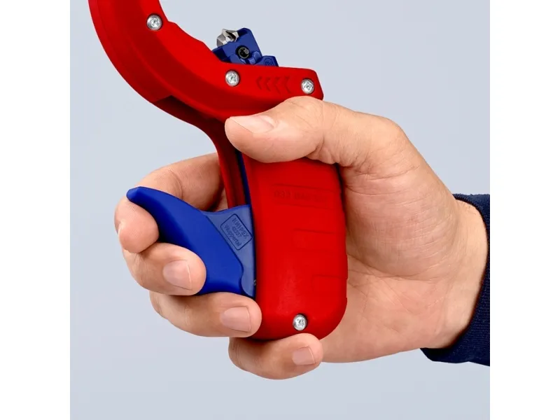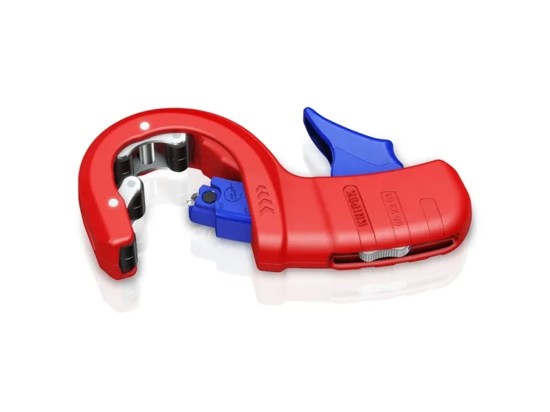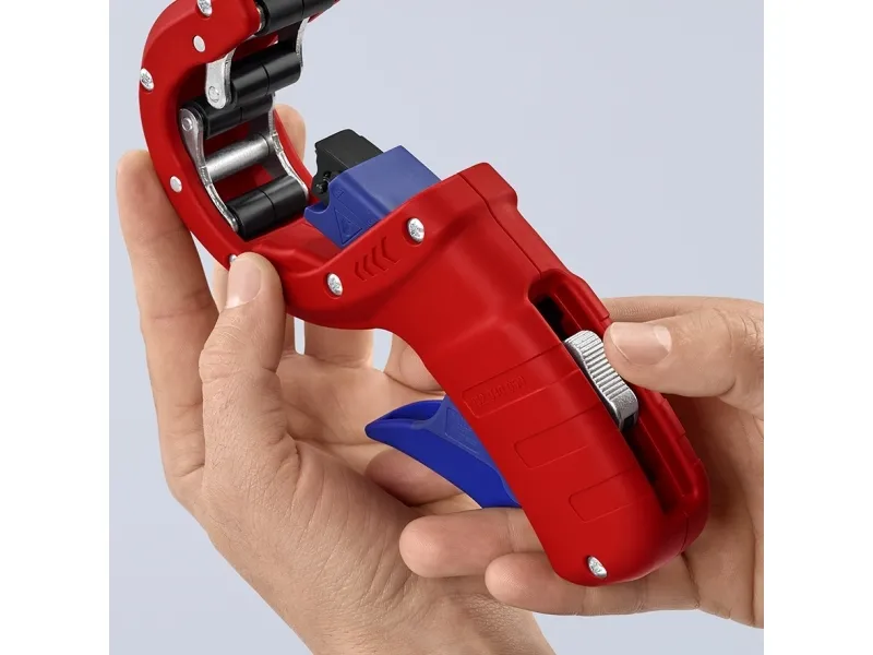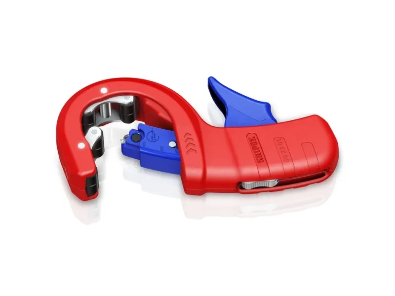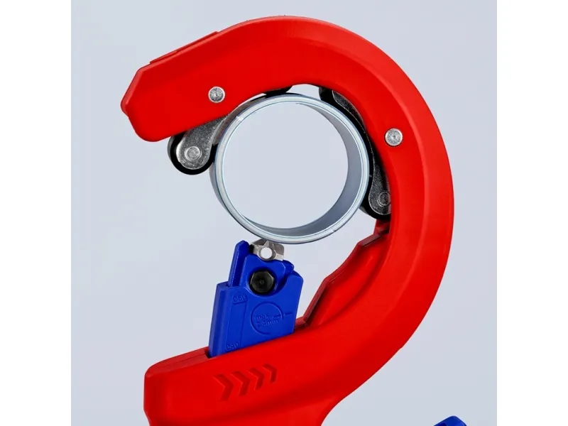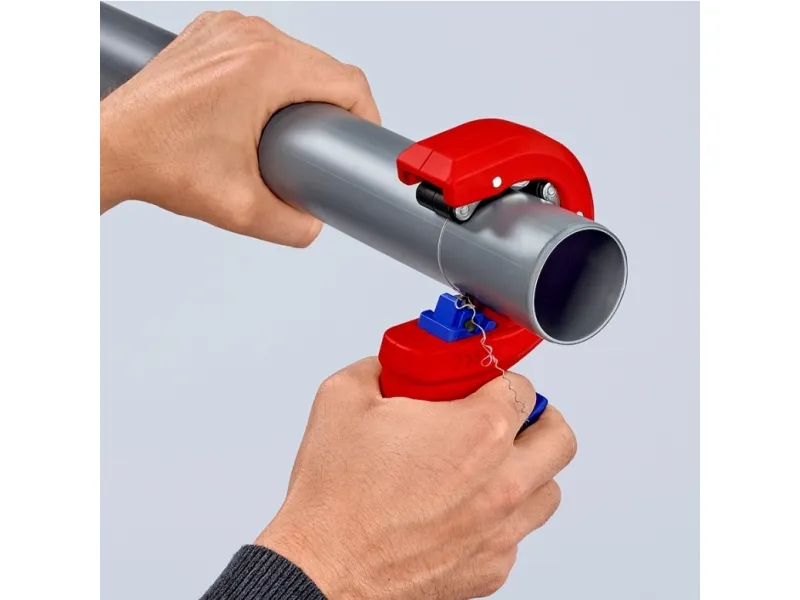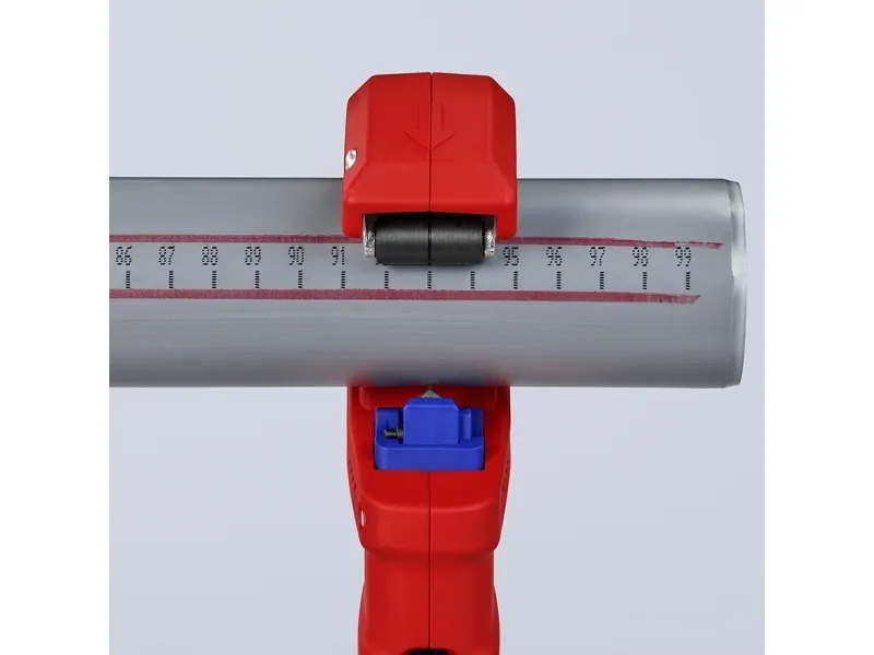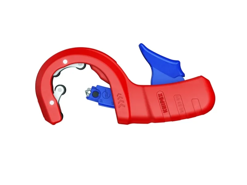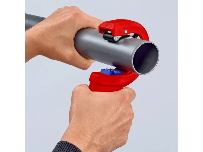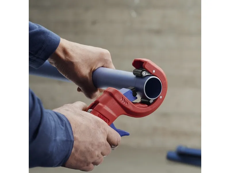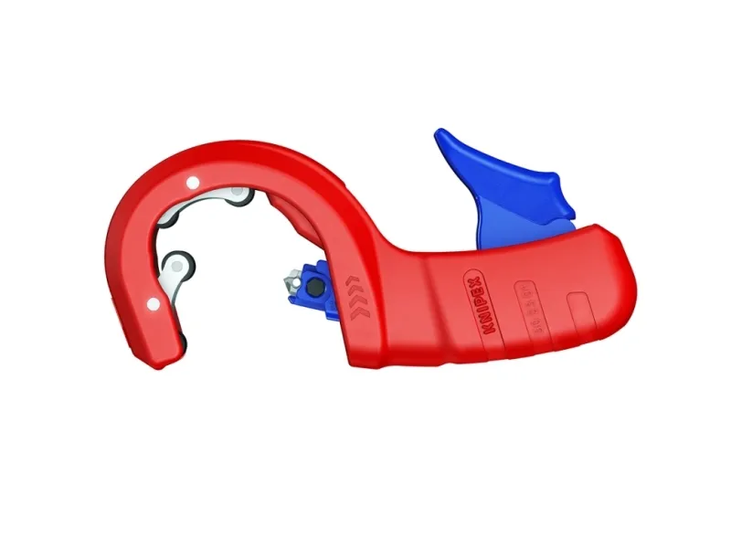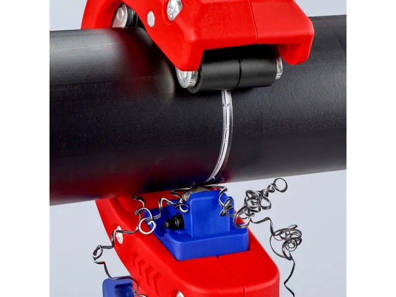 90 23 01 BK KNIPEX DP50 Perfekt værktøj til VVS'eren: Alle gængse plastafløbsrør op til Ø 50 mm skæres og affases nemt og hurtigt i én arbejdsgang. Vendbar klinge af kuglelejestål i topkvalitet, som skiftes uden brug af værktøj. Et glat snit: Ingen efterjustering, ingen afgratning, reduceret risiko for tilstopninger eller skader på pakningen. Skærer HT- og mange andre plastrør med Ø 32, 40 eller 50 mm og med vægtykkelser op til 2,4 mm. Optimal rørføring og nem skæring takket være selvjusterende ruller med glidelejer. Nem positionering med frit udsyn til skærestedet. Fjederbelastet skæreblad: ingen irriterende efterjustering nødvendig under skæring. Vendbar klinge med dobbeltskær, som vendes ved slitage, klingeskift uden brug af værktøj. Omskæring eller finskæring fra ca. 10 mm sektionslængde mulig. Værktøjskrop af robust glasfiberforstærket plast.