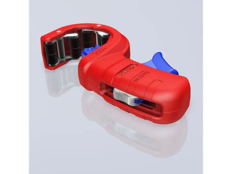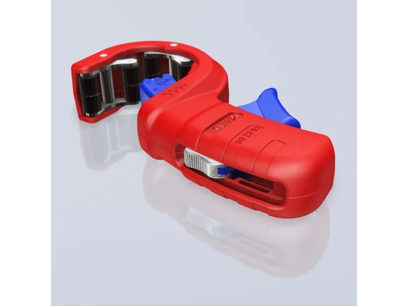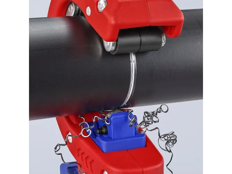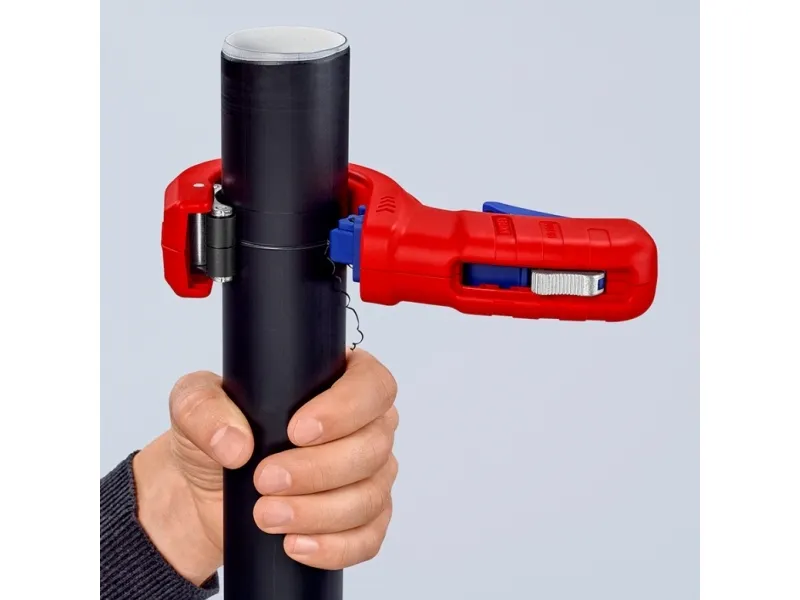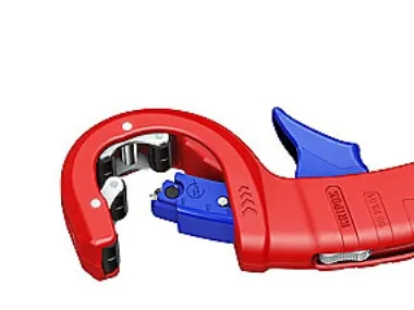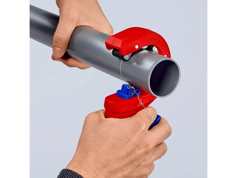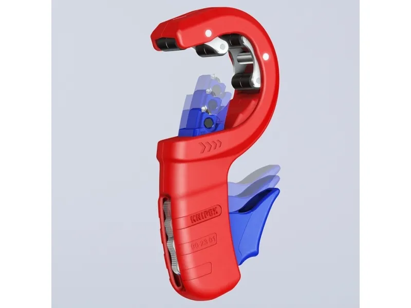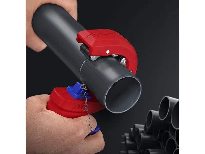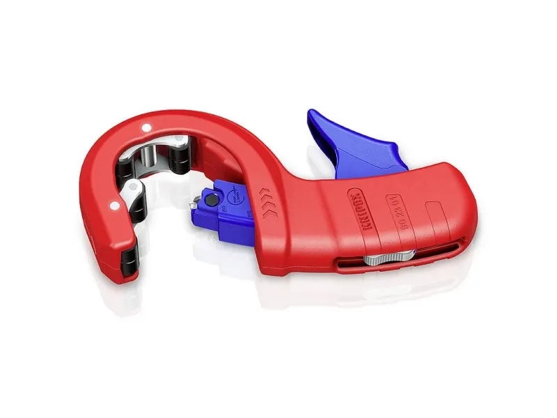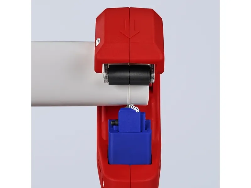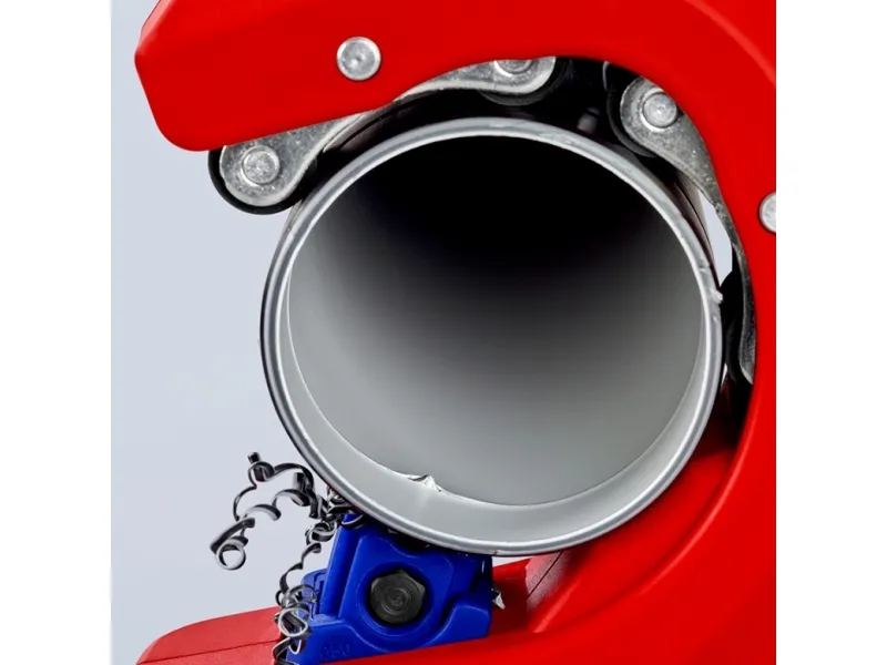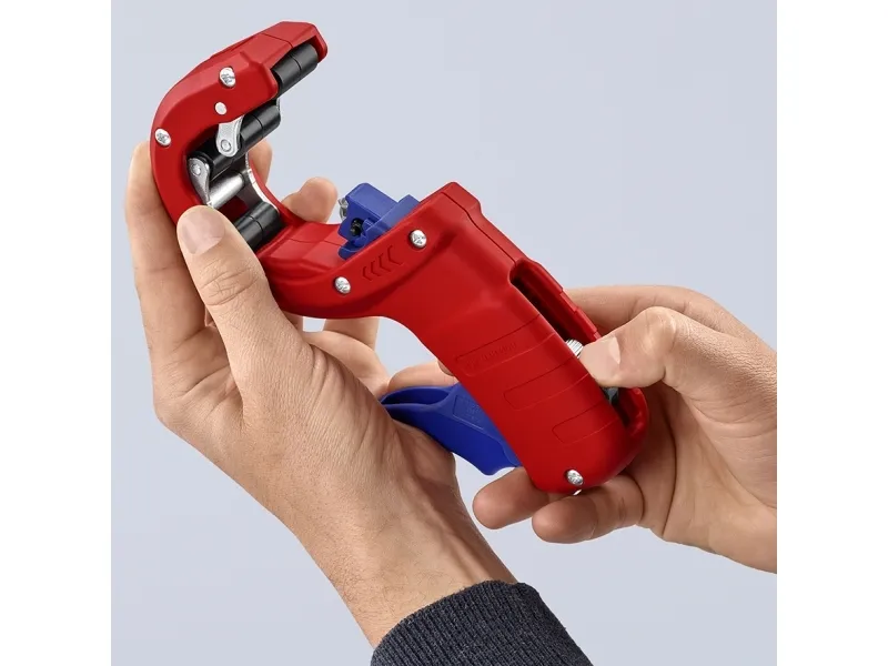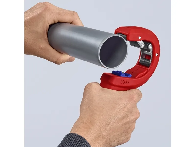 90 23 01 BK KNIPEX DP50 Perfekt værktøj til VVS'eren: Alle gængse plastafløbsrør op til Ø 50 mm skæres og affases nemt og hurtigt i én arbejdsgang. Vendbar klinge af kuglelejestål i topkvalitet, som skiftes uden brug af værktøj. Et glat snit: Ingen efterjustering, ingen afgratning, reduceret risiko for tilstopninger eller skader på pakningen. Skærer HT- og mange andre plastrør med Ø 32, 40 eller 50 mm og med vægtykkelser op til 2,4 mm. Optimal rørføring og nem skæring takket være selvjusterende ruller med glidelejer. Nem positionering med frit udsyn til skærestedet. Fjederbelastet skæreblad: ingen irriterende efterjustering nødvendig under skæring. Vendbar klinge med dobbeltskær, som vendes ved slitage, klingeskift uden brug af værktøj. Omskæring eller finskæring fra ca. 10 mm sektionslængde mulig. Værktøjskrop af robust glasfiberforstærket plast.