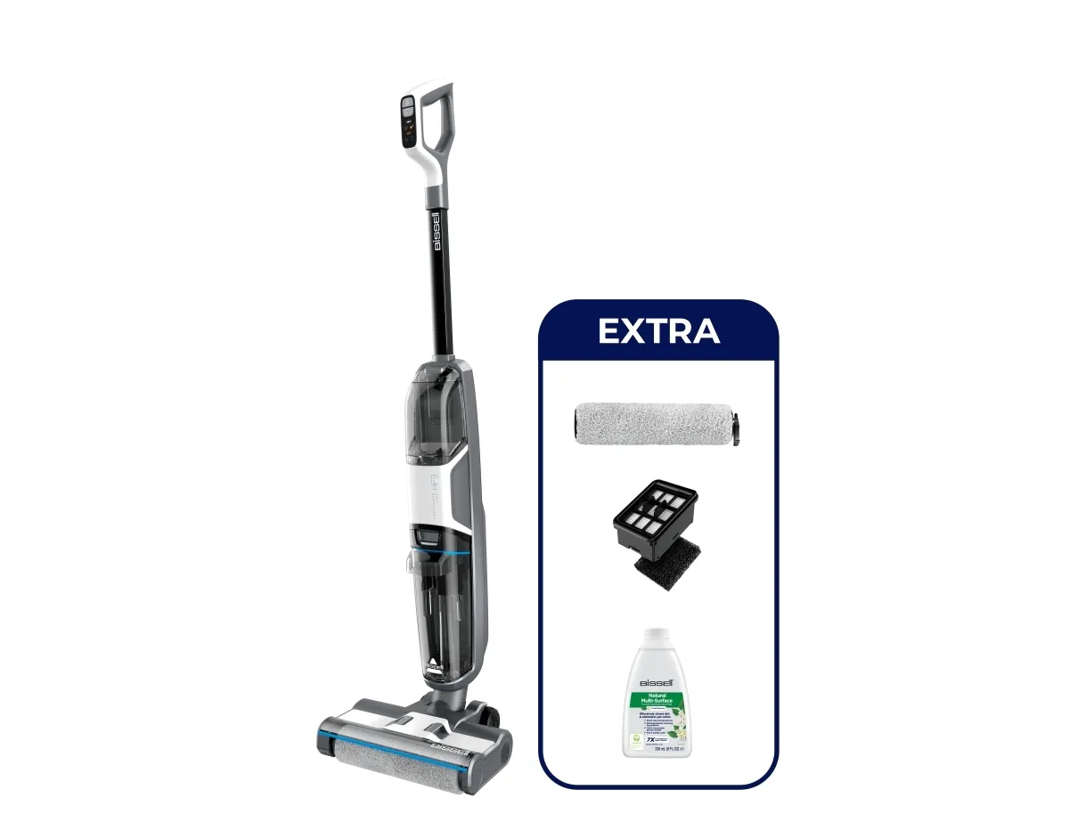The BISSELL CrossWave HF3 Cordless Pro vacuums and mops your hard floors in one go. Enjoy quiet, cordless cleaning and saving time. This lightweight and easy-to-carry device offers time-saving convenience by combining vacuuming and mopping in one go. Be ready to give your hard floors a serious clean, right before your friends or family arrive! With automatic fluid delivery, convenient self-propelled steering, and simple auto cleaning modes the CrossWave HF3 Cordless Pro cleaner is a joy to use. Clean in Low-Mode for quick light clean-up or switch to High-Mode for the tough messes that hit your hard floors. Unlike the traditional mop and bucket, their Two-Tank Technology keeps the clean and dirty water separate. Therefore, with the CrossWave HF3 Cordless Pro cleaner, you will always clean your hard floors with fresh clean water. The included Natural Multi-Surface Floor Cleaning Solution (236 ml) eliminates odors leaving your home smelling fresh. When you're done cleaning, the CrossWave HF3 Self Cleans with a push of a button. This does not only clean the brush roll, but also the inside of the machine so that there is less clean-up after each use.