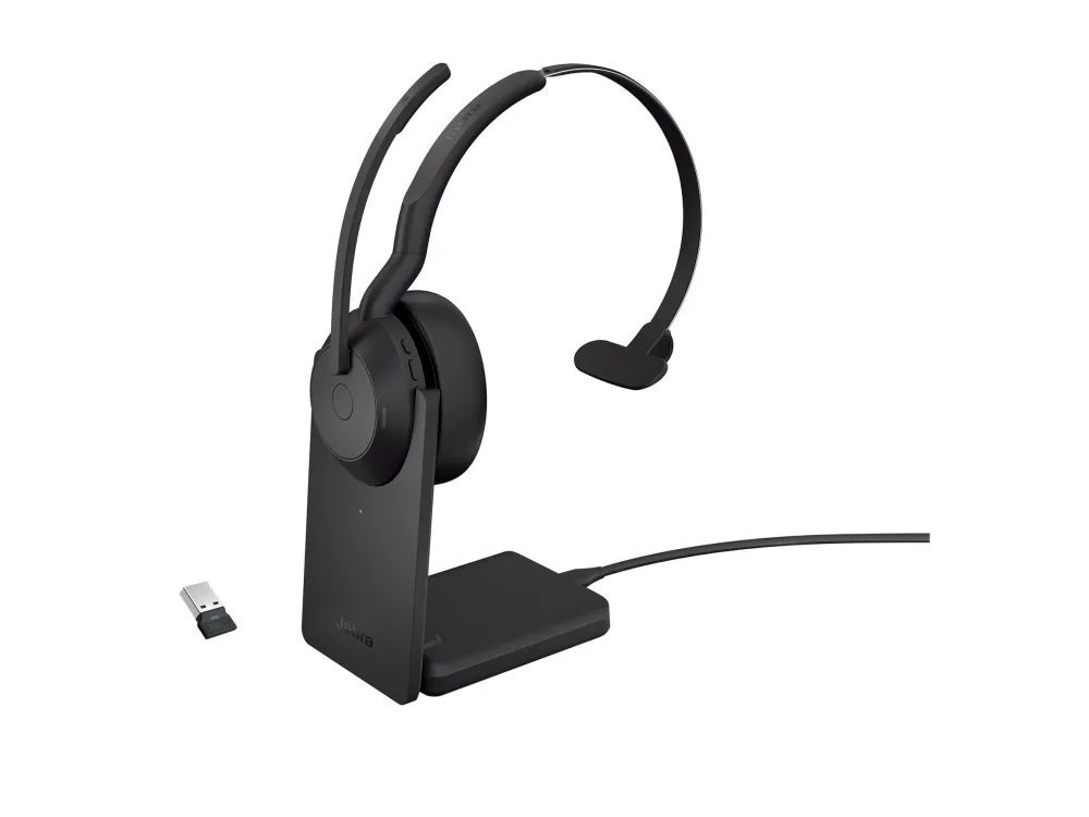 Jabra Evolve2 55 UC Mono - Hodesett - on-ear - Bluetooth - trådløs - aktiv støydemping - USB-A - svart - med ladestativ - Cisco Webex Certified, Alcatel-Lucent Certified, Avaya Certified, MFi Certified, Google Meet Certified, Amazon Chime Certified, Google Fast Pair Certified