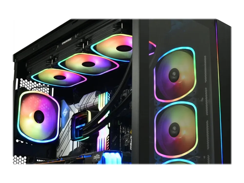 The Enermax Aquafusion ADV series ELC-AQFA360-SQA processor liquid cooling system is designed to provide efficient cooling solutions for high-performance CPUs. This 360 mm CPU liquid cooler features three 120 mm fans that operate at a rotation speed of 500-2000 rpm, ensuring optimal airflow and cooling efficiency. Equipped with Shunt-Channel-Technology (SCT) and a ceramic bearing pump, this cooling system delivers effective cooling and enhances longevity. With compatibility across multiple socket types including LGA1700, AM4, and LGA2066, this cooler accommodates a wide range of CPU configurations, making it a versatile choice for gamers and enthusiasts. Additionally, the inclusion of the ENERMAX RGB Control Box allows users to customize RGB lighting and synchronize with Razer Chroma RGB and other major motherboard lighting solutions, creating an aesthetically pleasing setup.