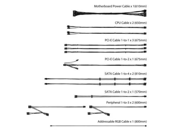 AC-inngangskabel - ekstern Strøm 24-stifts ATX med avtakbar 4-stifts modulær kabel 61 cm 2 x strøm 8-stifts +12 V med avtakbar 4-stifts seksjon modulær kabel 65 cm 16-stifts 12VHPWR strømkabel 67.5 cm 3 x 8-pins PCI Express-strøm med avtakbar 2-pins delmodulkabel 2 x 2x 8-stifts PCI Express-strøm med avtakbar 2-stifts delmodulkabel 3 x Seriell ATA-kabel ARGB-synkroniseringskabel 2 x 4-pins intern strømkabel