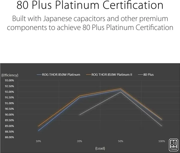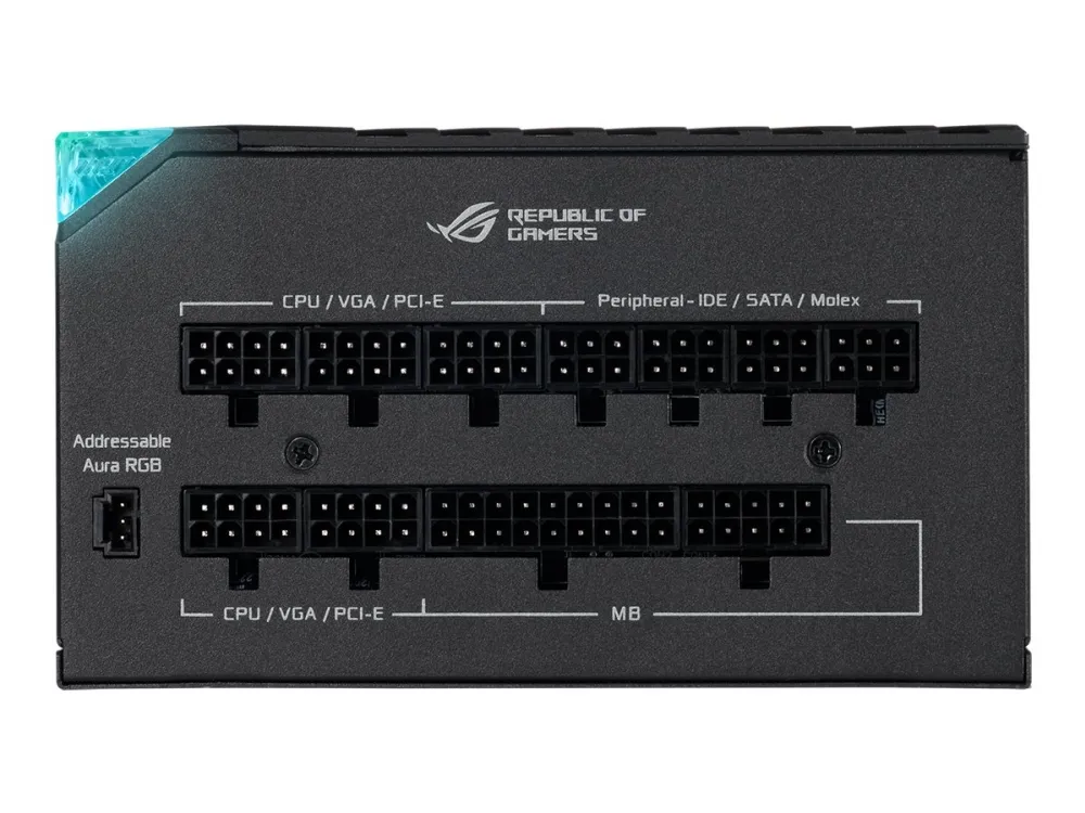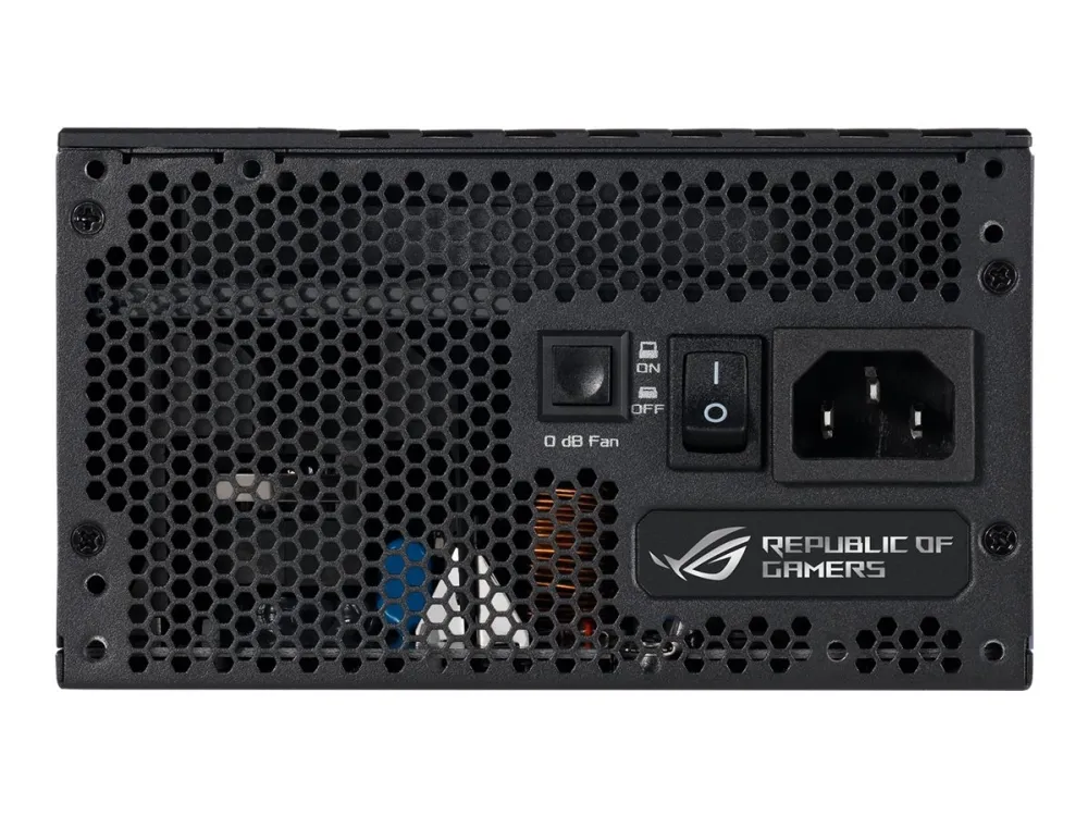 Muffekabler, overstrømbeskyttelse, overspenningsvern, overstrømsbeskyttelse, underspenningsbeskyttelse, kortslutningsbeskyttelse, kjølevifte med dobbeltkulelager, termobeskyttelse, OLED-display, helt modulær, ASUS Aura Sync, ROG-kjøle, 0db Technology, Lambda A++ Certification