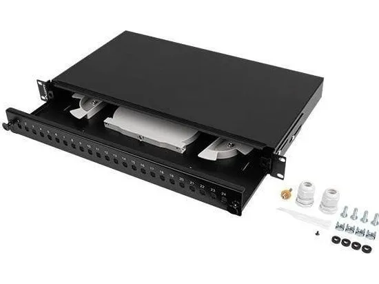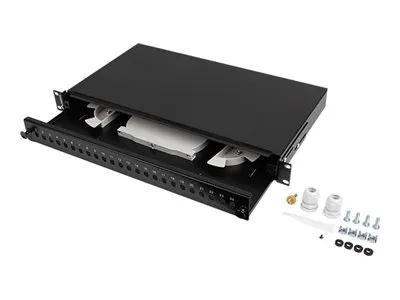The Lanberg Fiber Patch Panel is a robust solution designed for efficient organization and management of fiber optic connections. This unit features 24 ST/FC wall outlet connectors, allowing for seamless integration and connectivity. Constructed from durable steel and ABS plastic, this patch panel ensures longevity and resistance against wear and tear. Included in the package are essential components such as screws, two cable glands, cable ties, a tray holder, and a splice cassette, making installation straightforward and efficient. With a height of 1 rack unit and a rack size of 19 inches, this rack-mountable panel fits easily into existing setups, providing an orderly environment for network management. The pull-out feature and numbered ports enhance usability and accessibility, ensuring that troubleshooting and maintenance can be performed quickly and effectively.