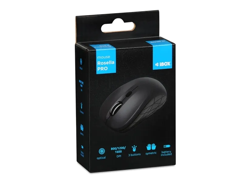 iBOX Rosella PRO - Mus - høyre- og venstrehåndet - optisk - 3 knapper - trådløs - 2.4 GHz - USB trådløs mottaker - svart - hengeboks