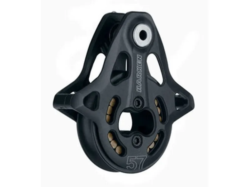 Max line Ø12mm. Længde: 86mm. Skive: Ø57mm SWL: 1134 kg. Brudstyrke: 2268kg. Vægt: 125g Runner-blok til løbende bagstag. Harkens Black Magic blokke er stærke, lette og letløbende, og kaldes også for Harkens arbejdsheste på grund af deres høje styrke-/ vægtforhold, og ekstremt lette løb. Det er must have- blokken, uanset om du sejler lokalt eller globalt. Med Torlon rulleleje. Delrin kugler i siderne tager belastningen sideværts. Sideplader og skive er hård-anodiseret og Teflon- belagt aluminium. Kan skilles helt ad ved at løsne tre skruer, uden løse kugler.