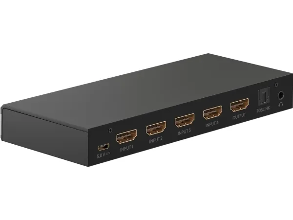 HDMI™-switch muliggør samtidig tilslutning af op til 4x HDMI™-kildeenheder til 1x HDMI™-udgangsenhed