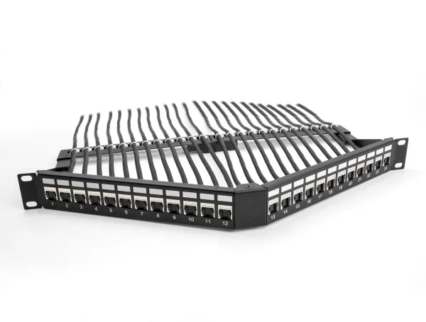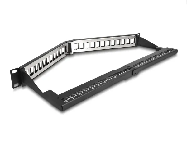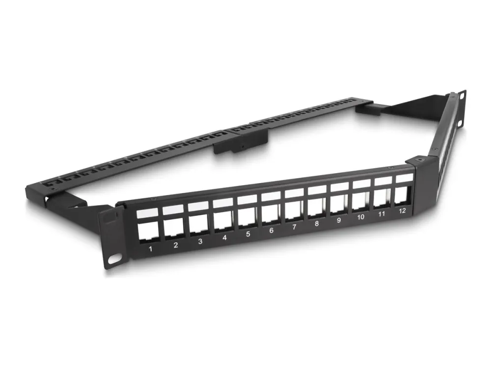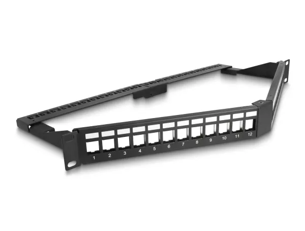 The Delock keystone patch panel is a robust solution designed to meet the demands of any networking setup. With its 24-port configuration, this patch panel supports extensive connectivity options, making it ideal for complex network environments. The angled design, complete with strain relief, ensures that cables are managed efficiently and securely. Durability is a key feature, with the panel's metal construction and inclusion of a dust protective cover, ensuring it can withstand the rigors of daily use. Each panel is designed for easy installation in 19" racks, making it a versatile choice for various cabinet sizes. The package comes complete with 25 cable ties, a grounding wire, and screws, providing all the necessary components for a hassle-free setup. Whether for a new installation or upgrading an existing network, the Delock keystone patch panel offers a reliable and organized cabling solution.