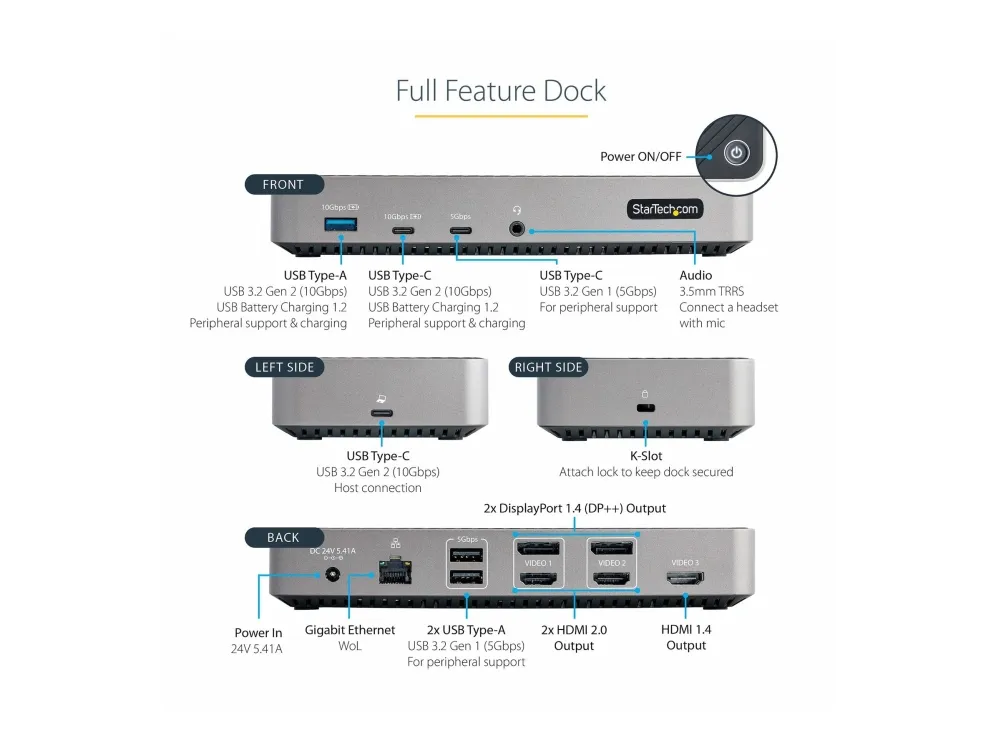 3 x audio / video - HDMI - 19 pin HDMI Type A 2 x skjerm/video - DisplayPort-utgang - 20-pins DisplayPort 1 x USB 3.2 Gen 2 - 9-pins USB-type A 1 x USB 3.2 Gen 2 - 24 pin USB-C 1 x USB 3.2 Gen 1 - 24 pin USB-C 2 x USB 3.2 Gen 1 - 9-pins USB-type A 1 x nettverk - RJ-45 1 x USB 3.2 Gen 2 - 24 pin USB-C 1 x lyd - 3,5 mm telefonjakk