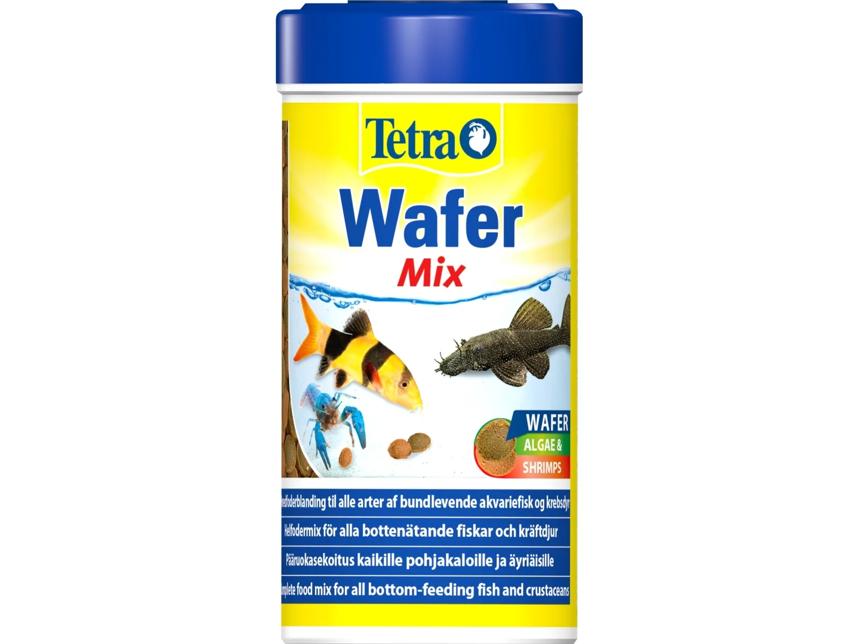 Tetra Wafermix - basisfodermix for kødædende og planteædende fisk og krebsdyr. Grøn vaffel med værdifuld spirulina alger, især for planteædende fisk. Brune skiver, især for kødædende fisk. Smuldrer ikke i vandet. Indhold: 250 ml