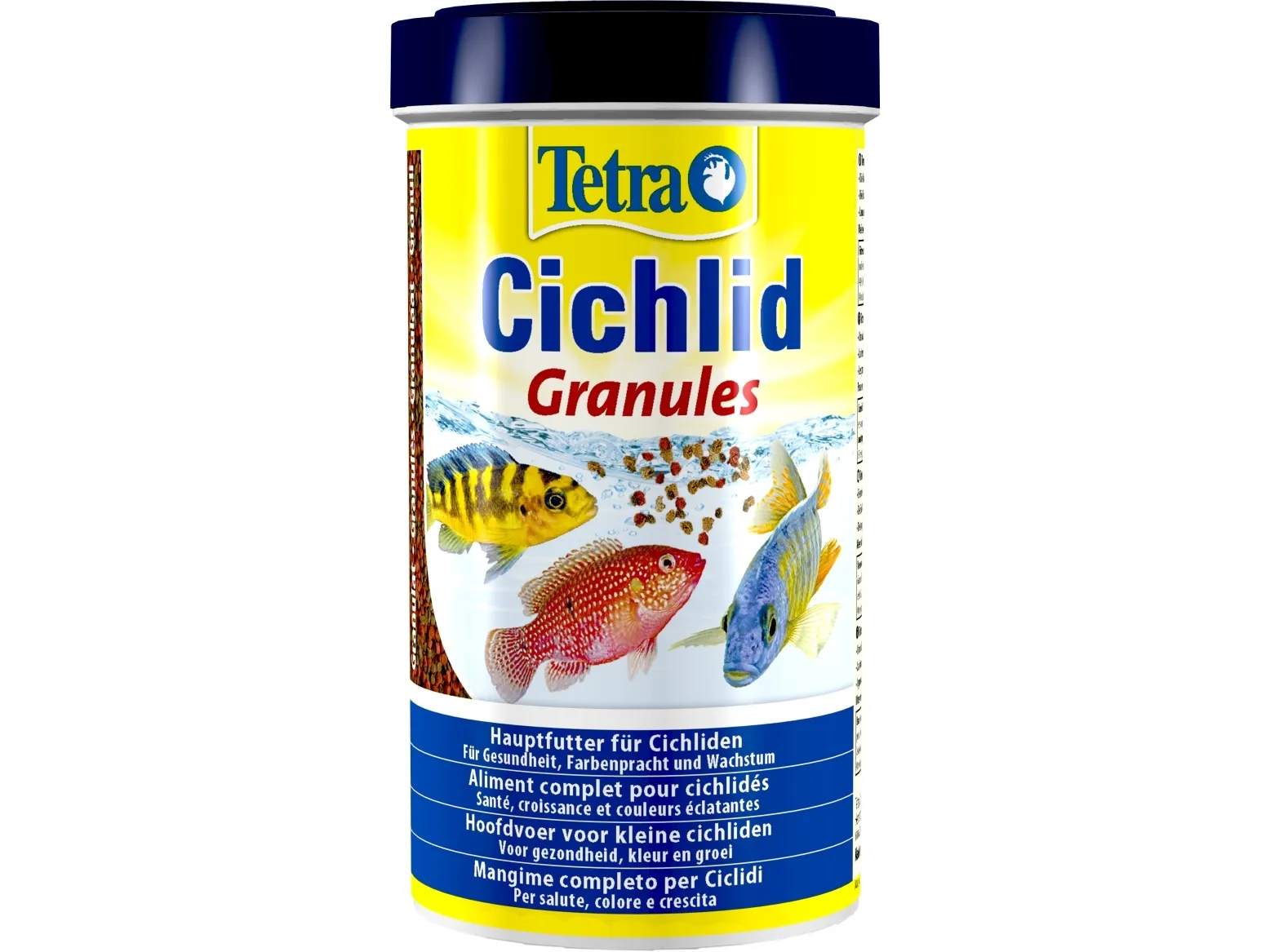 TetraCiclhlid granulat.Basisfoderblanding for alle typer af Mellemstore Cichlider - med den patenterede BioAktive ® formel, som består af to forskellige granulater. Blandingen er iddel for alle Cichlid typer.Indeholder naturlige carotinoider for mere intens farve Indhold: 500 ml