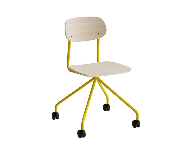 Atlas stol med formstøbt sæde og ryg beklædt med højtrykslaminat i hvidpigmenteret eg og stel af pulverlakeret stål. Fast 4-bens kryds på hjul, med en rygafstand der bliver en fin detalje men fungerer også som en integreret taskekrog. Atlas 2112 er velegnet som stol til højtrinnet og gymnasiet eller som kantinestol og konferencestol til det moderne kontor.