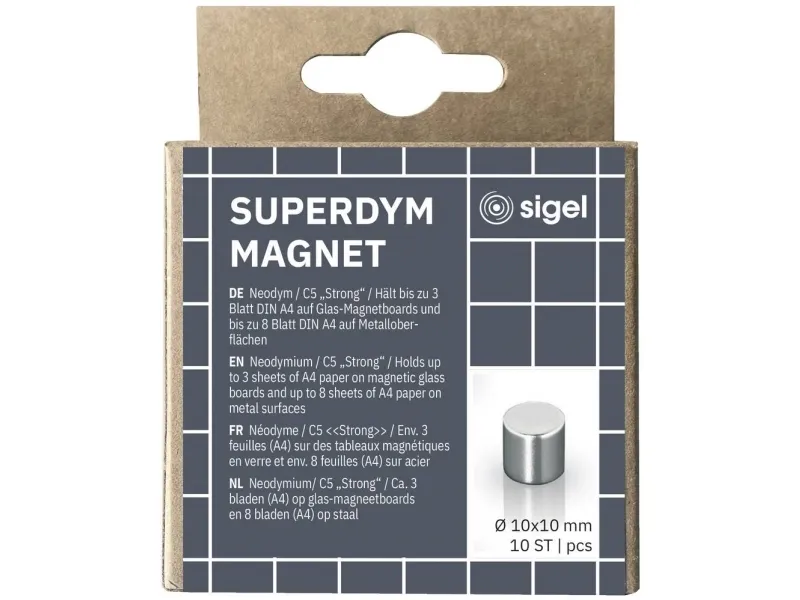 The magnets made of neodymium (1 x 1 cm, cylinder, silver, 10 pieces) hold up to 3 sheets (A4, 80 gsm) on magnetic glass boards and up to 8 sheets (A4, 80 gsm) on whiteboards. SIGEL"s high-quality board accessories really come into their own when you want to visualise ideas on whiteboards or magnetic glass boards, pin cards showing your workflow onto a pinboard, or enable the whole team to see how the project is progressing. This is where you"ll find everything you need for agile work methods. Simply choose your tools and get down to work!Sigel BA701. Form factor: Cylinder, Magnet type: Neodymium, Product colour: Silver. Width: 10 mm, Depth: 10 mm, Height: 10 mm. Quantity per pack: 10 pc(s), Package type: Hanging box