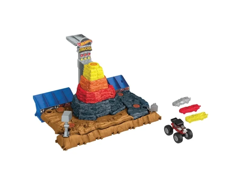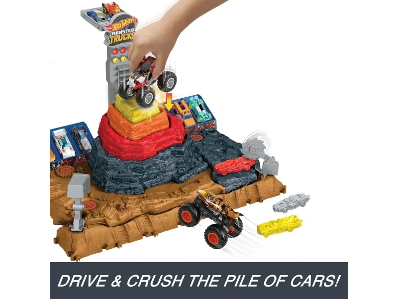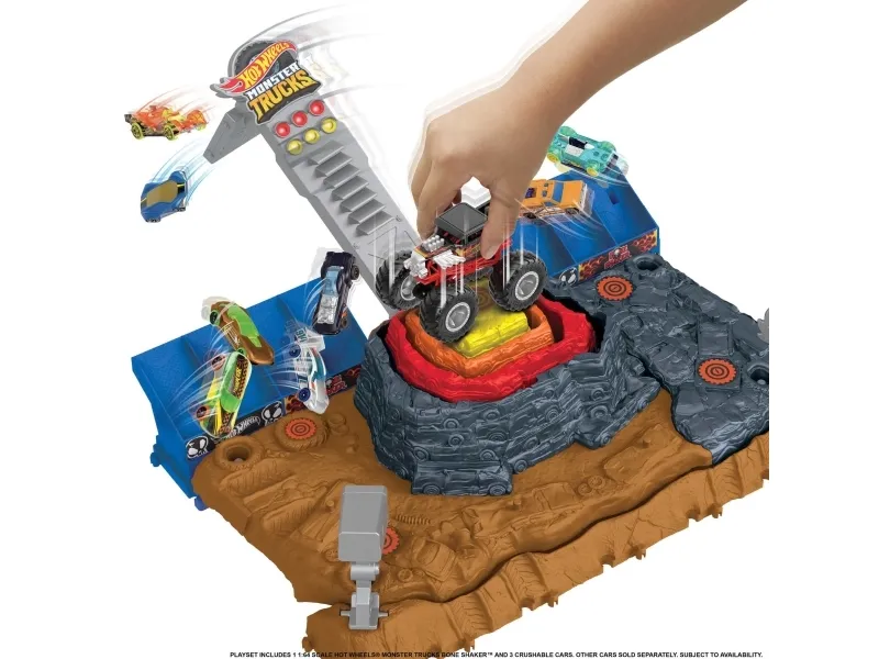 Kids can experience epic Monster Truck-style smashing and crashing in the Hot Wheels Monster Trucks Arena Smashers Bone Shaker Ultimate Crush Yard playset. Five smash spots indicate where the action takes place and the base moves and shakes, adding sensory feedback to enhance the play. The set includes a 1:64 scale Hot Wheels Monster Trucks Bone Shaker and 3 crushable cars for extra destruction. It can connect to other sets so kids can build out a Hot Wheels Monster Trucks Arena Smashers world. Each set sold separately, subject to availability. Colours and decorations may vary.Hot Wheels Monster Trucks Arena Smashers Bone Shaker Ultimate Crush Yard Playset. Product type: Monster truck & track set, Recommended age (min): 4 yr(s), Material: Plastic, Metal, Product colour: Multicolour