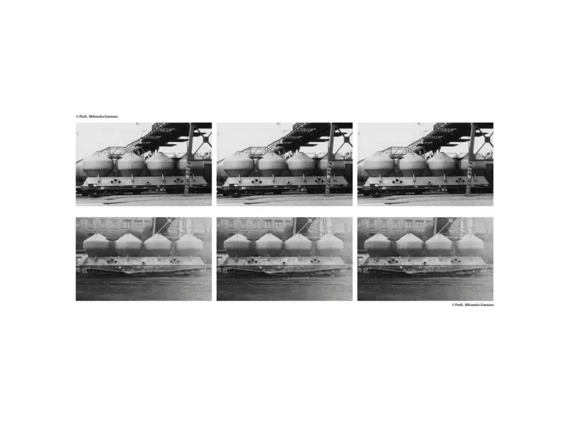 Silovogn-sæt konstruktion UACS Forbillede: 6 enakslede silovogne af konstruktionen UACS fra jernbaneselskabet #eskoslovenské Státní Dráhy (#SD). 3 Silovogn i udførelse med et lige og langt kabinet (kasse med rødbrun kasse) og 3 silovogn i designet med en forklæde (mosaigrøn kasse). Alle 6 vogne er med melongule beholdere. Driftstilstand omkring 1974.