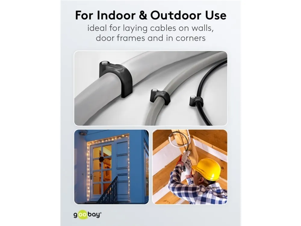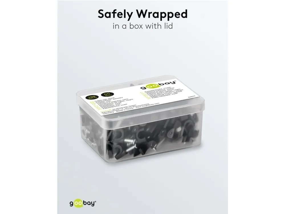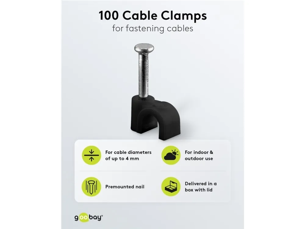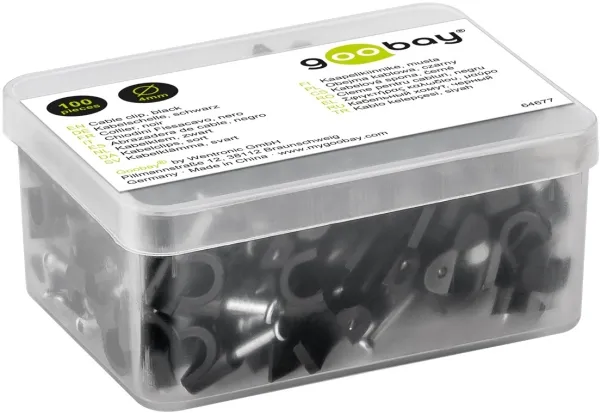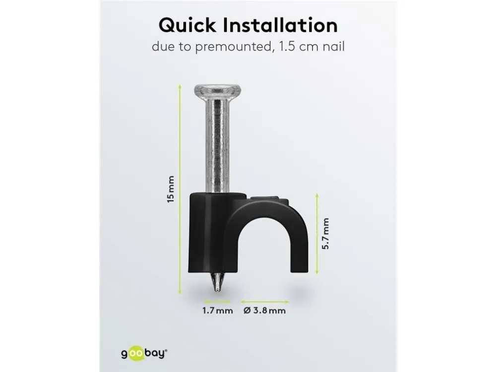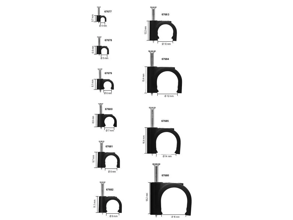 fastgørelse til kabler med en diameter på op til 4 mm Diameter Med angivelse af diameteren på klemmen for hurtig orientering Velegnet til overflademontering på træ eller murværk 100 kabelclips leveres i en genlukkelig æske Præmonteret søm til hurtig brug Dimensioner søm: 1,7 mm x 15,0 mm