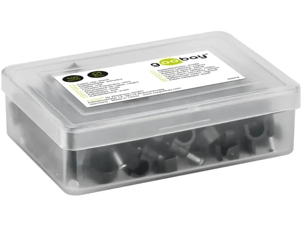 fastgørelse til kabler med en diameter på op til 6 mm Diameter Med angivelse af diameteren på klemmen for hurtig orientering Velegnet til overflademontering på træ eller murværk 100 kabelclips leveres i en genlukkelig æske Præmonteret søm til hurtig brug Dimensioner søm: 1,7 mm x 15,0 mm
