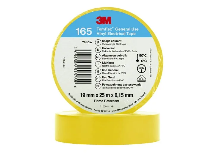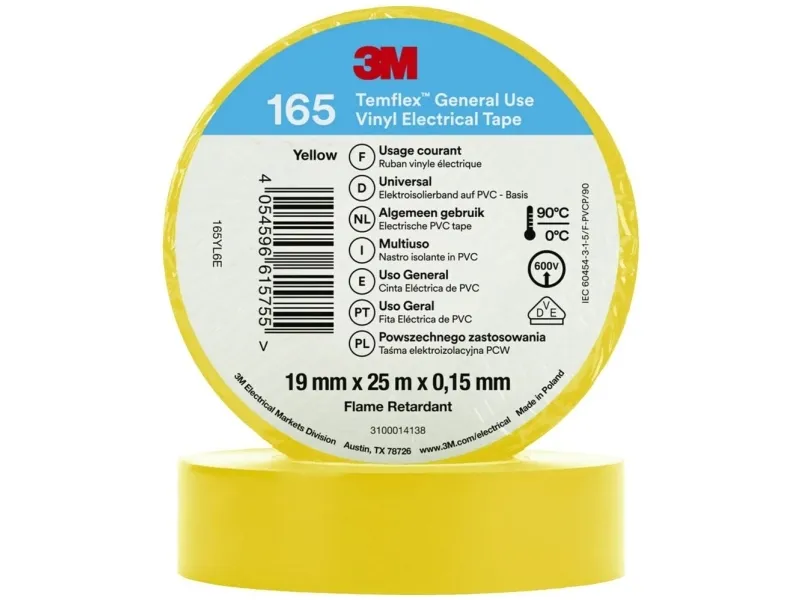 3M™ Temflex™ Vinyl-isoleringsbånd 165, gul, 19 mm x 25 m. God modstandsdygtighed over for slid, lud, syrer og de mest forskellige vejrforhold - herunder sollys · Giver høj elektrisk styrke · Beregnet til høj effekt ved omgivelsestemperaturer på op til 90 °C. · Professionelt tape, egnet til indendørs og udendørs brug · Fås i de industrigængse farver · VDE-CERTIFICERET, IEC 60454-3-1-5/F-PVCP/90 · Flammehæmmende 3M™™™ Vinyl-isolerbånd 165 er et 0,15 mm tykt professionelt pvc-isoleringsbånd, der er egnet til indendørs og udendørs brug. Brug 3M™ Temflex™ 165 Vinyl-isoleringsbånd til primærisolering, reparation og samling af ledninger og kabler (lavspænding). Dette professionelle tape giver en forbedret ydeevne og er egnet til indendørs- og udendørs brug.
