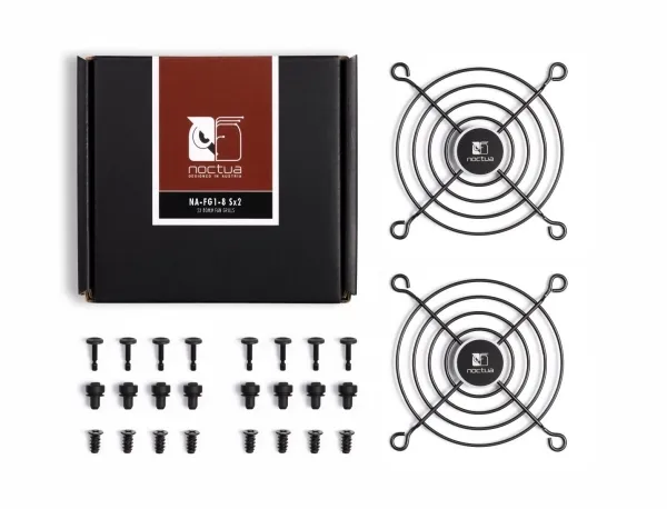 Sets of 2 and 5 The NA-FG1-8 are available in sets of 2 (NA-FG1-8 Sx2) and 5 (NA-FG1-8 Sx5). In addition to the fan grills, the kits include standard fan screws as well as Noctua’s unique, offset push-pin mounts for tool-free, acoustically optimised installation (one set of screws and one set of push-pins for each fan grill).Noctua NA-FG1-8 SX2. Type: Fan grill, Material: Steel. Diameter: 8 cm, Mounting hole pattern (W x D): 71.5 x 71.5 mm. Quantity per pack: 2 pc(s), Package type: Box