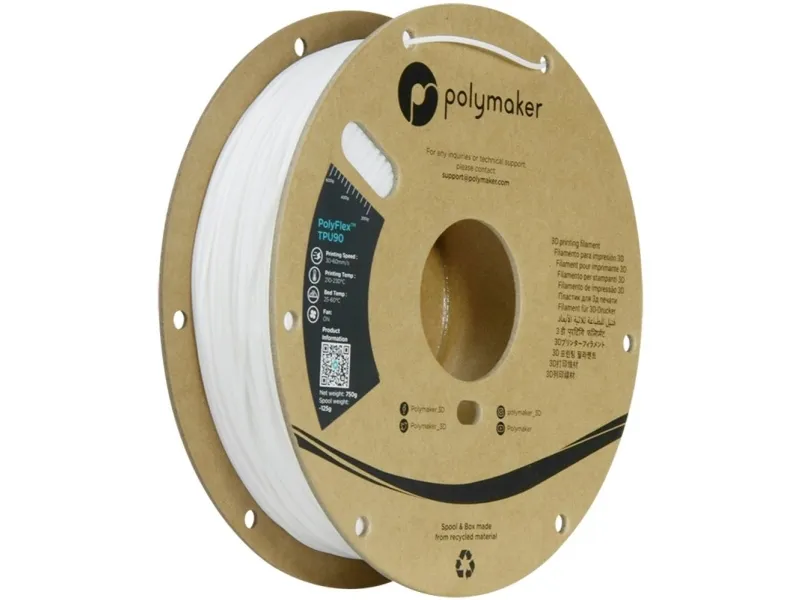 Polymaker Polyflex™ TPU90 1,75 mm 0,75 kg white (hex kode - #FFFF) - Shore hårdhed 90A Polyflex™ TPU90, udviklet fra Addigy® TPU-familien til Cofuro, giver den højeste grad af fleksibilitet i Polyflex™-familien. Med en shore-hårdhed på 90A og en brudforlængelse på 585 % er dette fleksible filament ekstremt blødt og alligevel trykbar. TPU90 er certificeret i henhold til ISO10993 og kan derfor anvendes til medicinske og hudkontaktapparater.