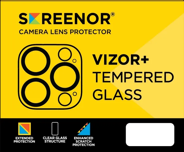 Beskyttelse av kameralinsen mot slag, riper og smuss. Screenor Vizor+ herdet glassbeskyttelse er produsert av støtsikkert herdet glass, som er mer enn 11 ganger sterkere enn standardglass og gir objektivet best mulig beskyttelse mot slag og riper uten å påvirke kamerafunksjonen. Den er enkel å montere. Når den beskytter kameralinsen, kan den bli slitt eller gå i stykker ved et uheldig slag, men da er den lett å fjerne. Skjermbeskytteren i glass tåler ikke bøying.